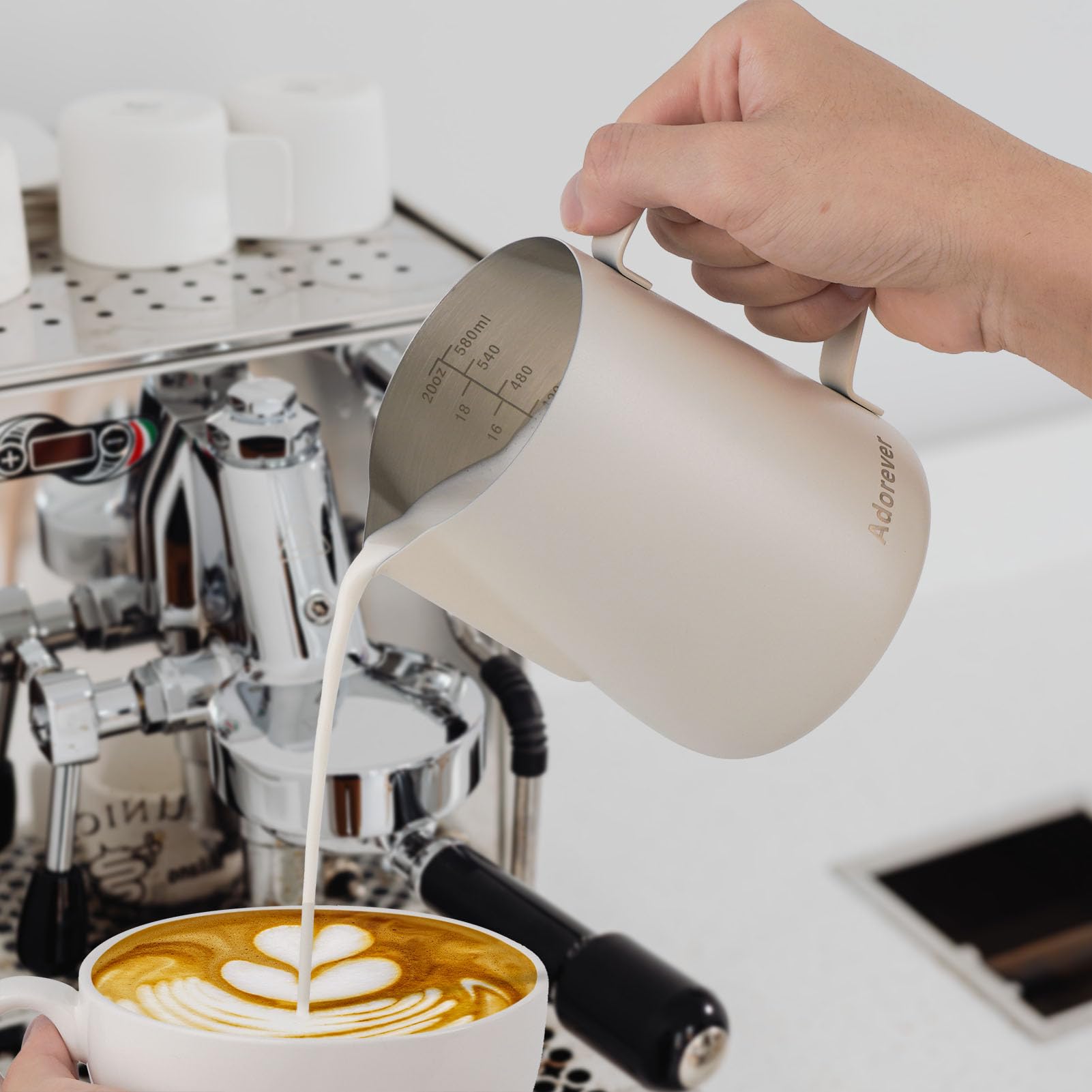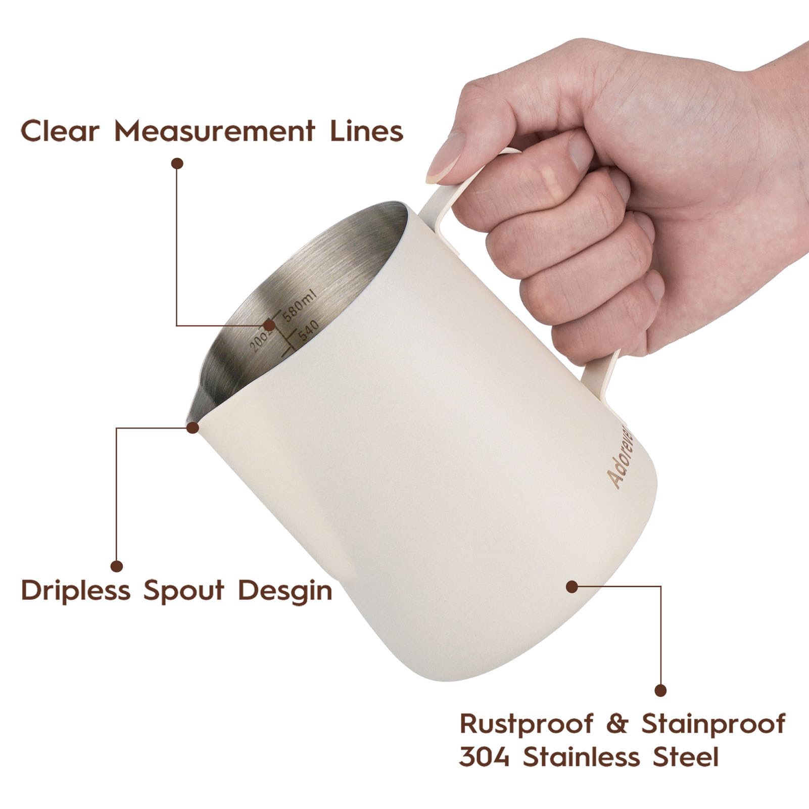 Become a Barista at home and start your day with a perfect cup of coffee. The Adorever jug is perfectly designed for coffee and foaming milk. Comfortable handle - The sturdy handle of milk pitcher is much safer and more comfortable to grip. Measurement scale - The milk cup is marked with volume scales for ultimate control of how much milk or cream each cup of coffee needs, turn your milk or cream into delicious and fluffy foam. It also measure any sauces with the internal measurement markings. Convenient Using - The stylish stainless steel finish enables you to use this jug for serving milk and cream for your guests. Suit for coffee lovers, suitable for home, kitchen, coffee shop, hotel etc. Lightweight & Portable - Designed for one or two people. With a tiny shape, it is easy to carry and store. Compact design, making it convenient to carry to everywhere you travel. Pac