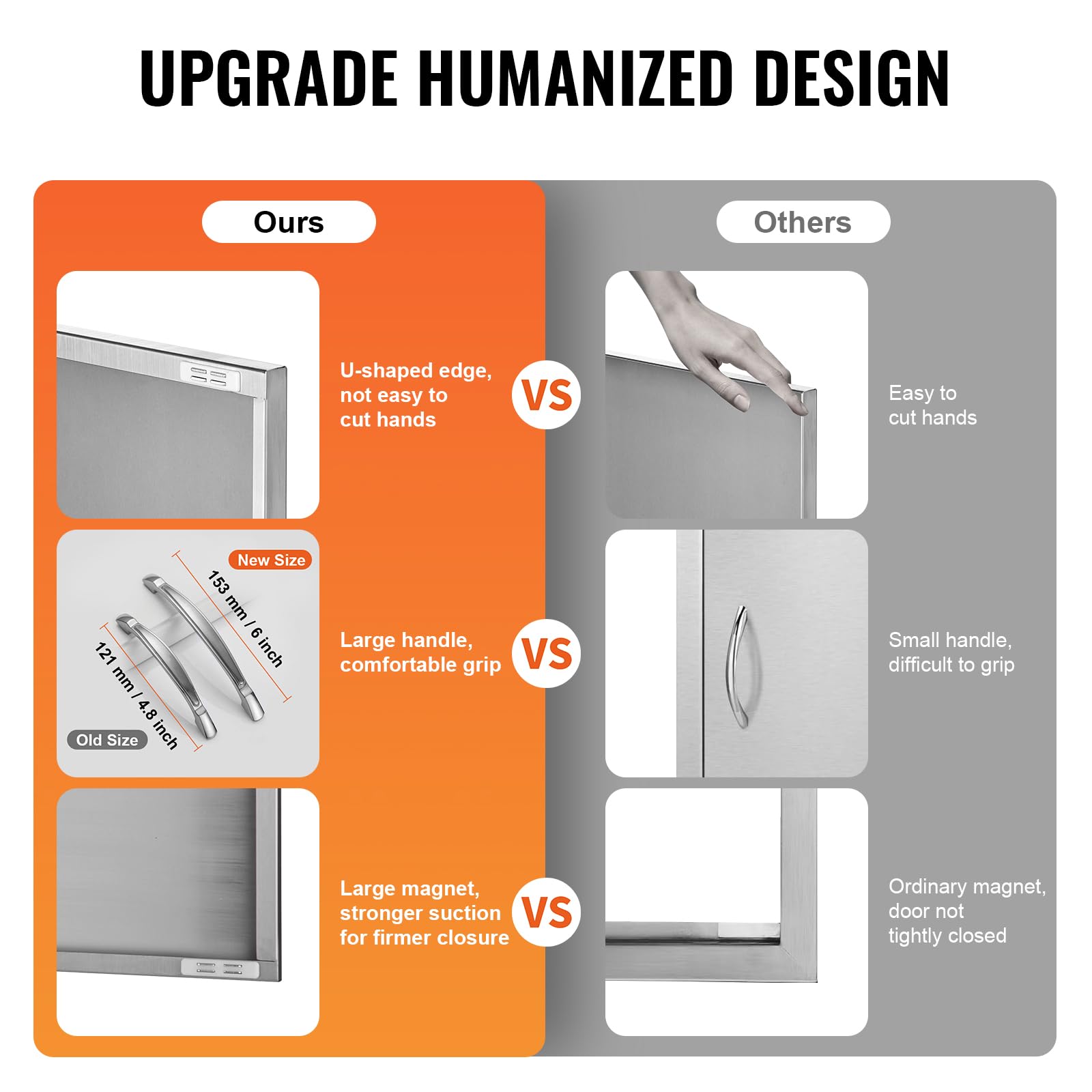 Humanized Design: Delicate zinc alloy handles conforming to ergonomics, enlarged size for easy opening. The door frame edges are bent and thickened for safer use, providing a more user-friendly experience, allowing you to enjoy cooking in your outdoor kitchen without worries.