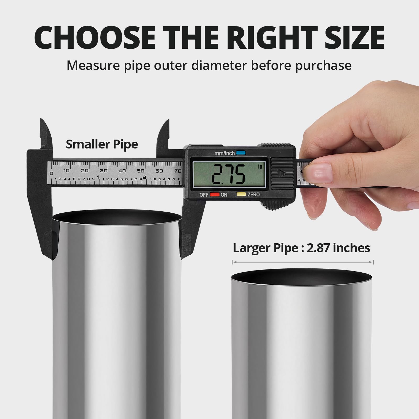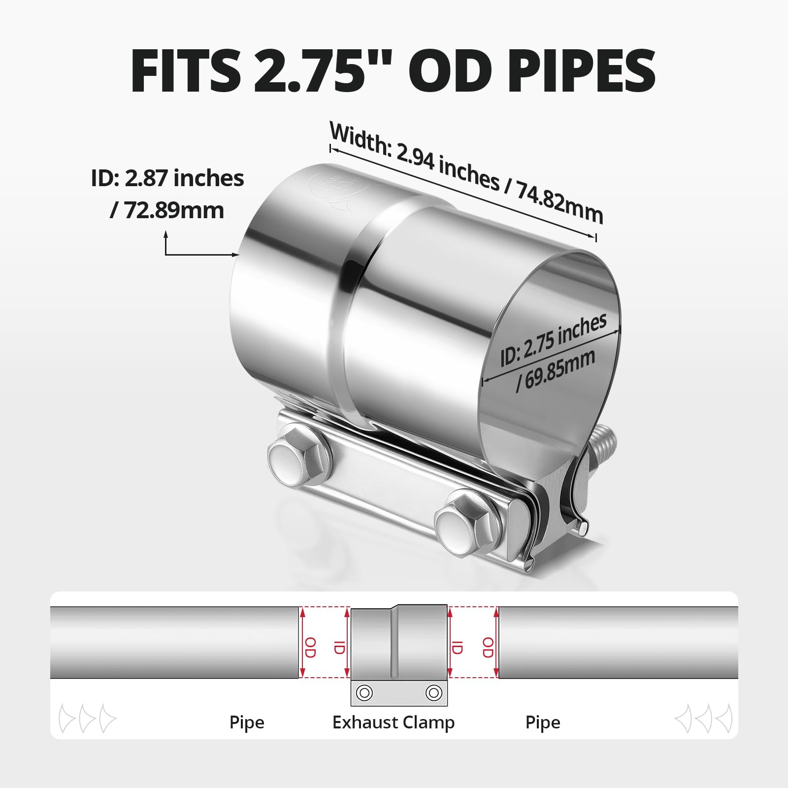 Size: joins 2.75'' OD pipe to 2.75'' ID pipe, width of strap: 2.94inch /74.82mm.Accurately measure the outer diameter of the pipe before placing an order