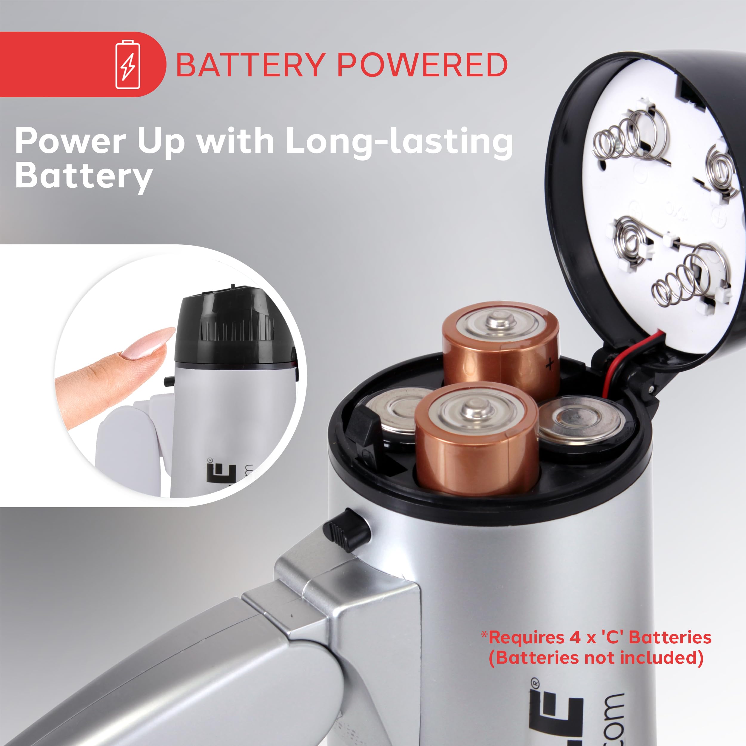 20 WATT POWER: The power output of the portable megaphone is 20 watts max. It is battery-operated and requires (4) x ‘C’ batteries. It also has a silver ergonomic pistol grip design and mini lightweight chassis
