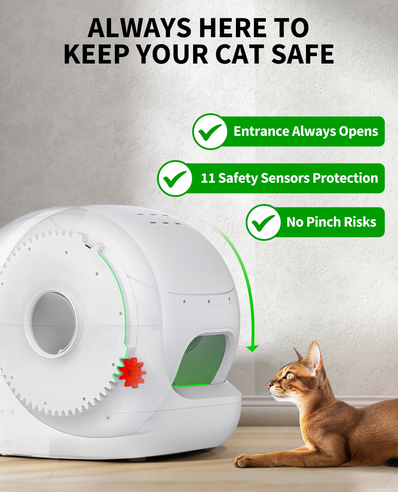 100% Safe for Your Cats: The PuraMax 2 cat litter box is equipped with 7 infrared sensors and 4 weight sensors that accurately detect the activity of cats inside or approaching the cat litter box. When the cat approaches the detacting area, the cat litter box pauses to ensure the cat's safety. In addition, the anti-pinch structure keeps the entrance open all the time to prevent your cat from getting stuck.
