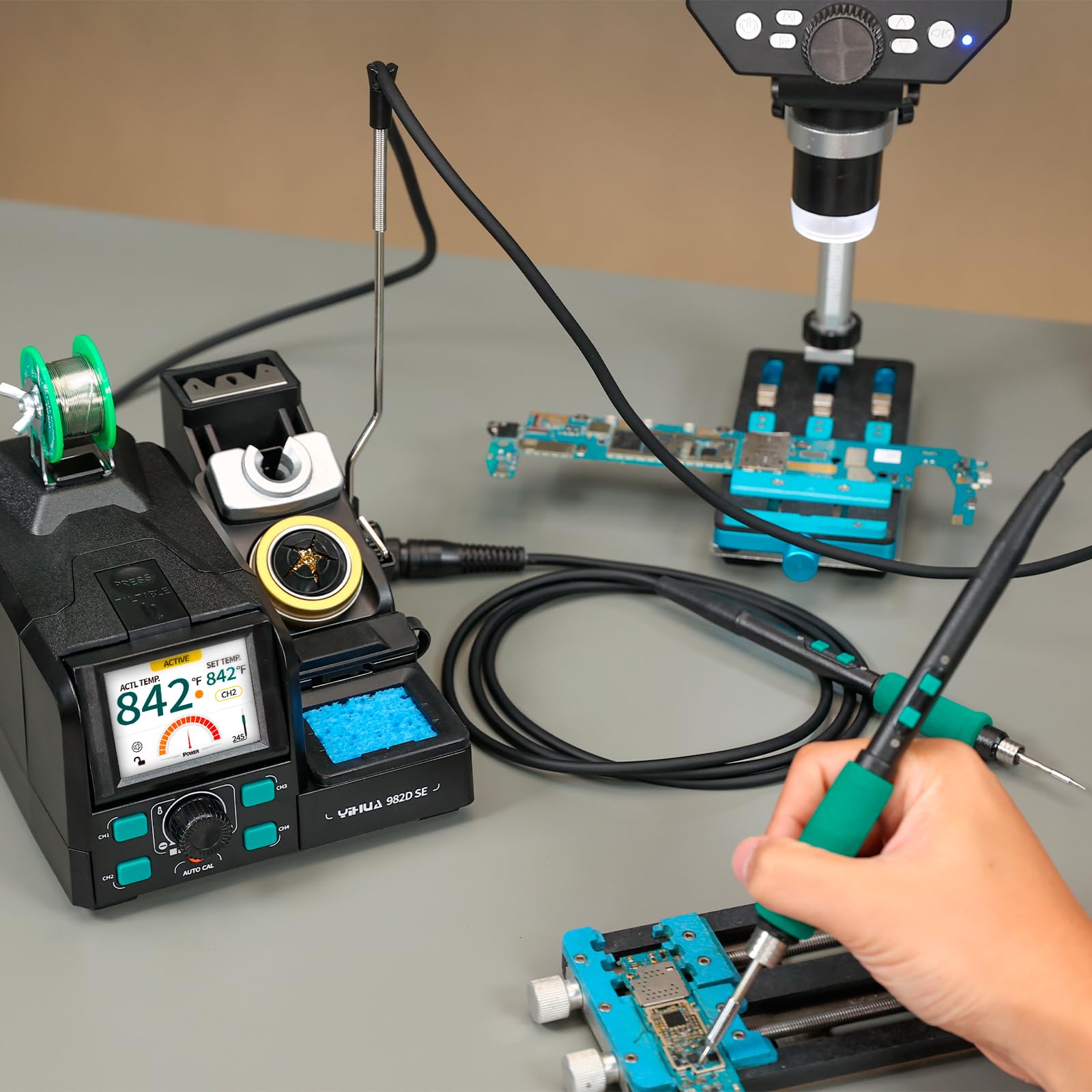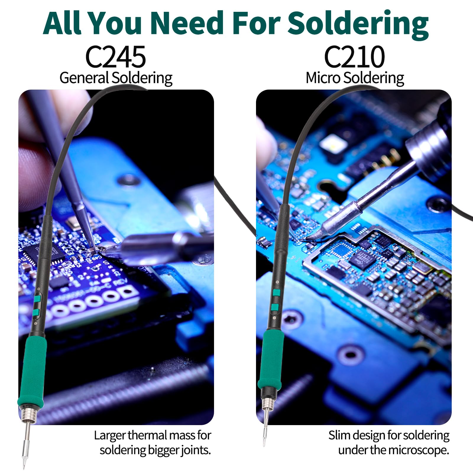 This micro soldering kit includes a 200W precision soldering station that provides rapid heating with convenient cartridge soldering tip (C245 & C210 compatible); The soldering irons melt solder in just 2 seconds and are ESD-safe
