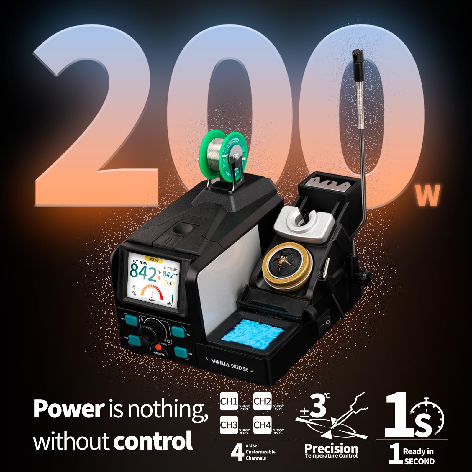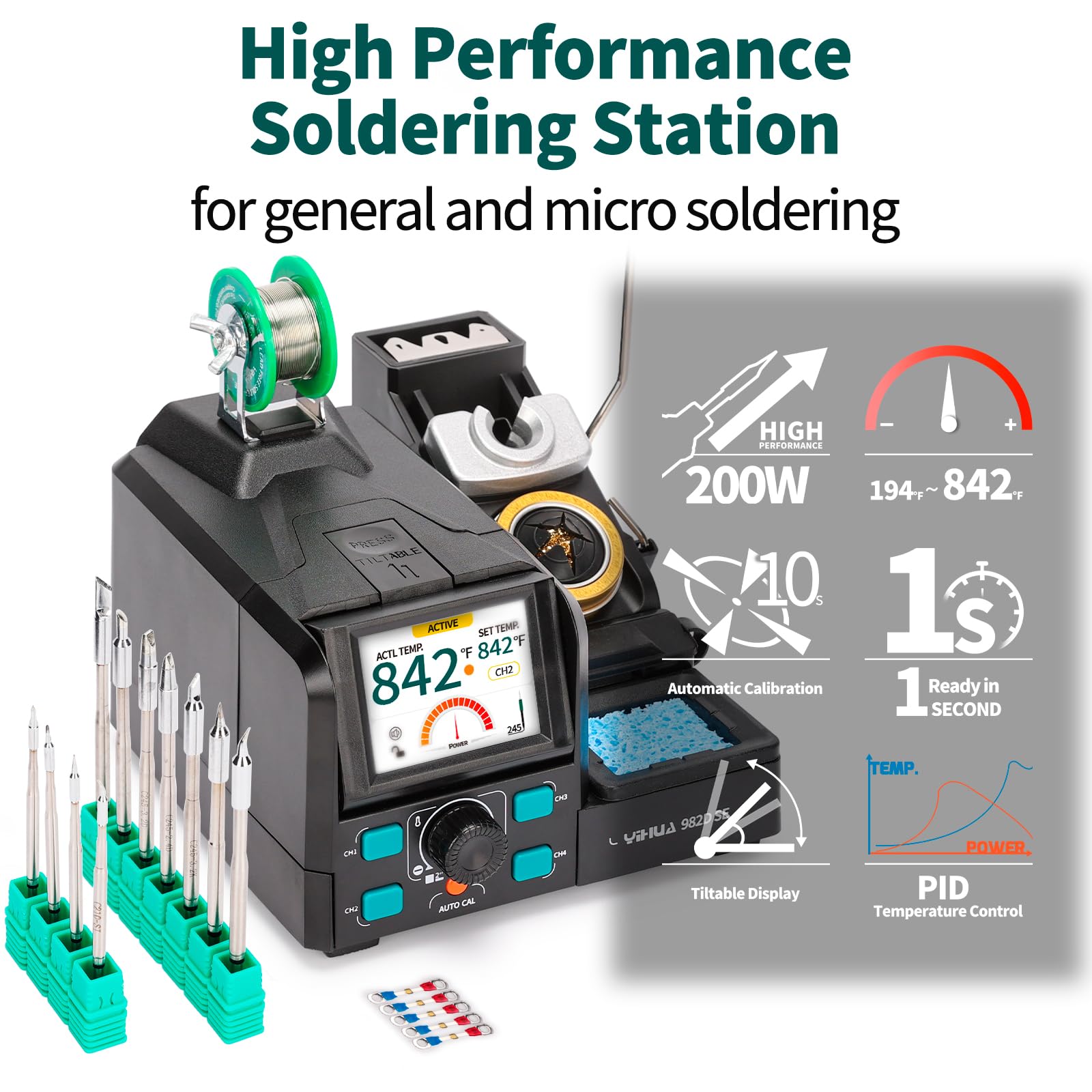 Supports PID temperature control with adjustable temperature from 194°F to 842°F, functions include 4 customizable preset temperature channels, sleep mode, standby mode, °C/°F conversion, buzzer config