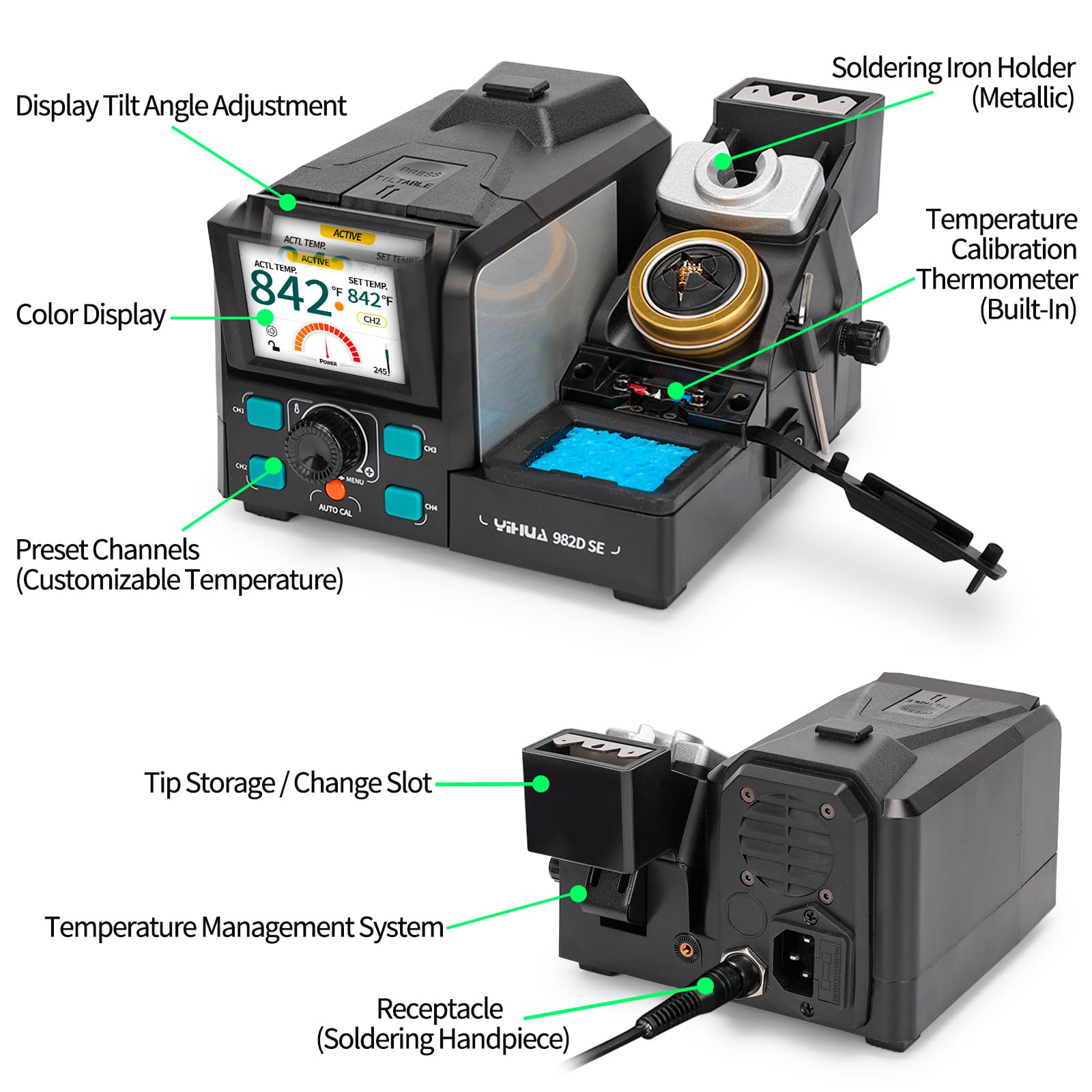 The main unit features a tiltable full-color display, metallic soldering iron holder with metallic solder collector, tip storage slot / tip change slot, cable guide, solder wire dispenser