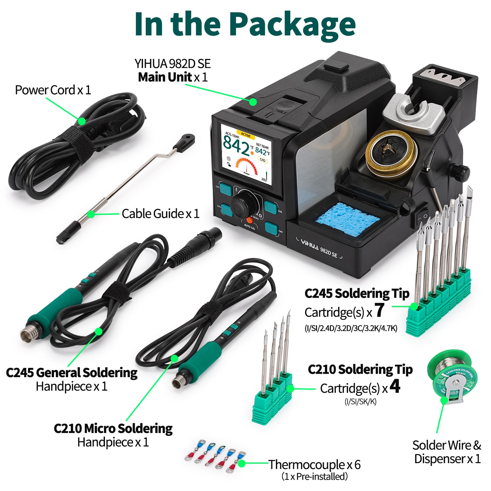 Package includes 11 cartridge soldering tips (C245 I/SI/2.4D/3.2D/3C/3.2K/4.7K & C210 I/SI/SK/K), 2 Handpieces (C245 & C210), Lead-Free Solder, 6 Thermocouples, Cable Guide