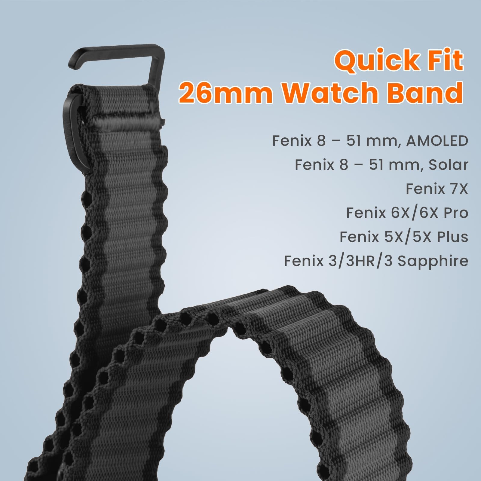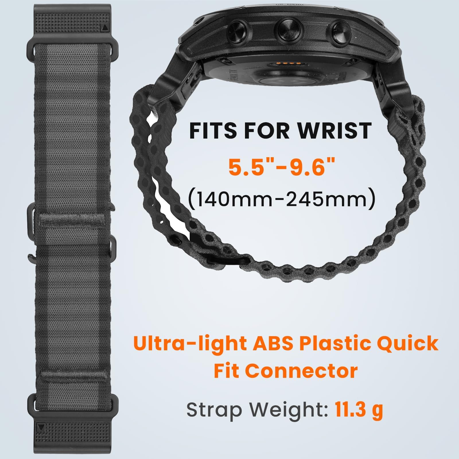 Ultra-Light Quick Fit Connector: This replacement watch band for Garmin fenix 5x features a lightweight ABS plastic quick release connector, weighing only 14g (0.03 lb). Compared to heavier metal connectors, the ABS material ensures the band feels nearly weightless on your wrist—perfect for athletes and outdoor adventurers who want minimal distraction during long workouts or explorations.