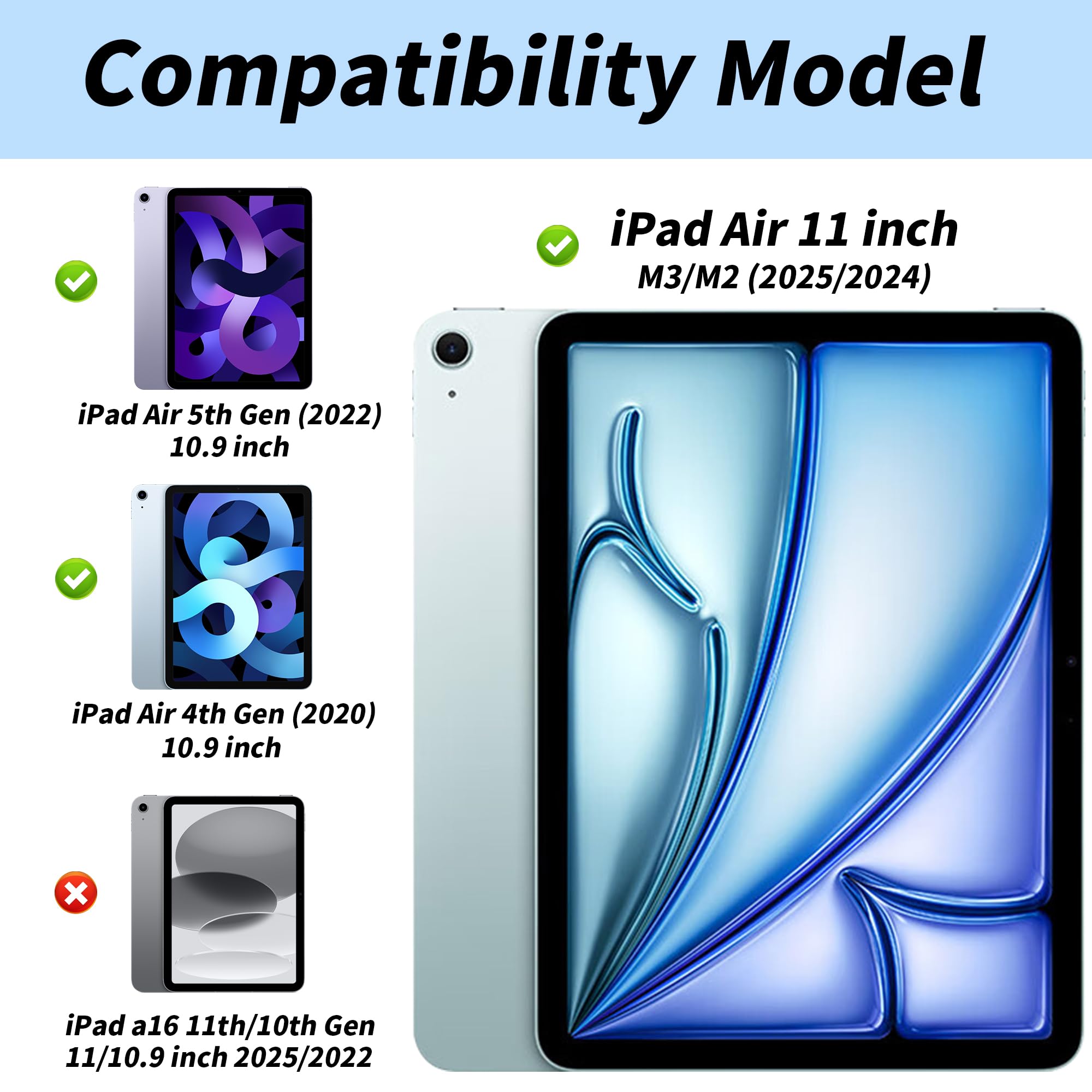 【Compatible Model】Case designed for iPad Air 11-inch M3/M2 (2025/2024), iPad Air 5th/4th Generation 10.9 inch (2022/2020) released tablet. Model number: A2589 A2591 A2588 A2324 A2072 A2316 A2325, Not compatible with any other devices. Please check the back bottom of your iPad to find the model number.