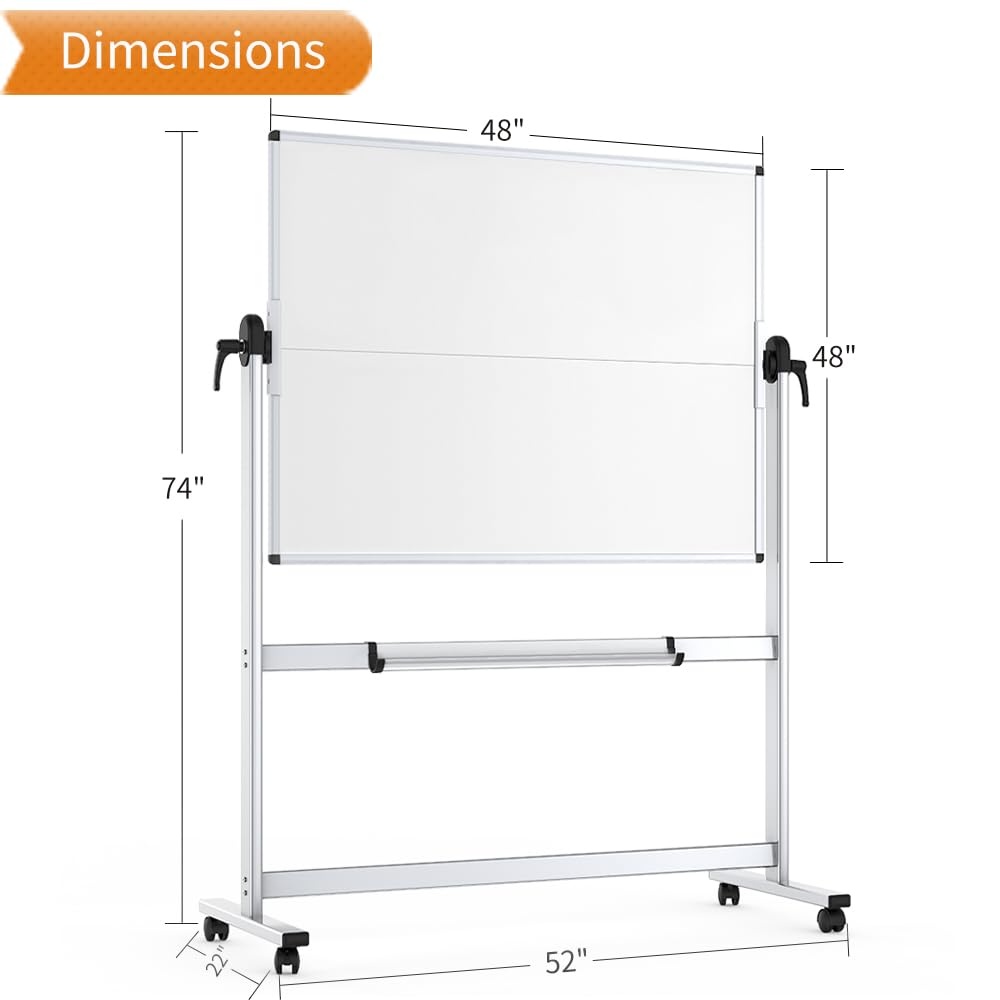 [Double-sided Mobile Whiteboard] Board dimensions: 47.2" x 47.2" ( frame included); Writing surface size: 45.7" x 45.7". Package size: 48.43" x 25.98" x 2.56". Our double-sided rolling magnetic dry erase whiteboard makes your presentation, teaching or training more efficient and orderly.