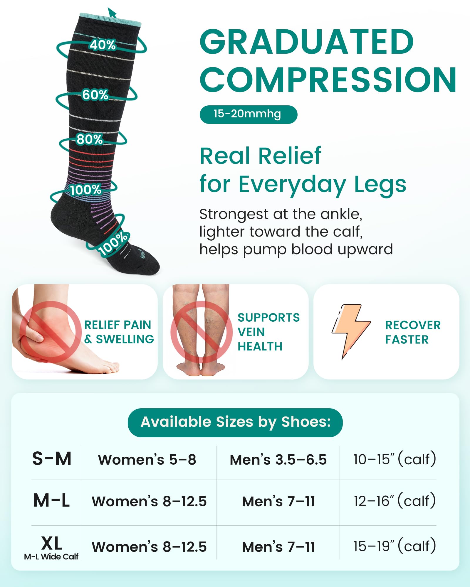 ADVANCED 4-ZONE GRADUATED COMPRESSION: 15-20 mmHg tested compression socks offer targeted Arch-to-Knee support, boosting circulation and reducing swelling. Ideal for flying, travel, nurse, pregnant women, prolonged standing & daily wear