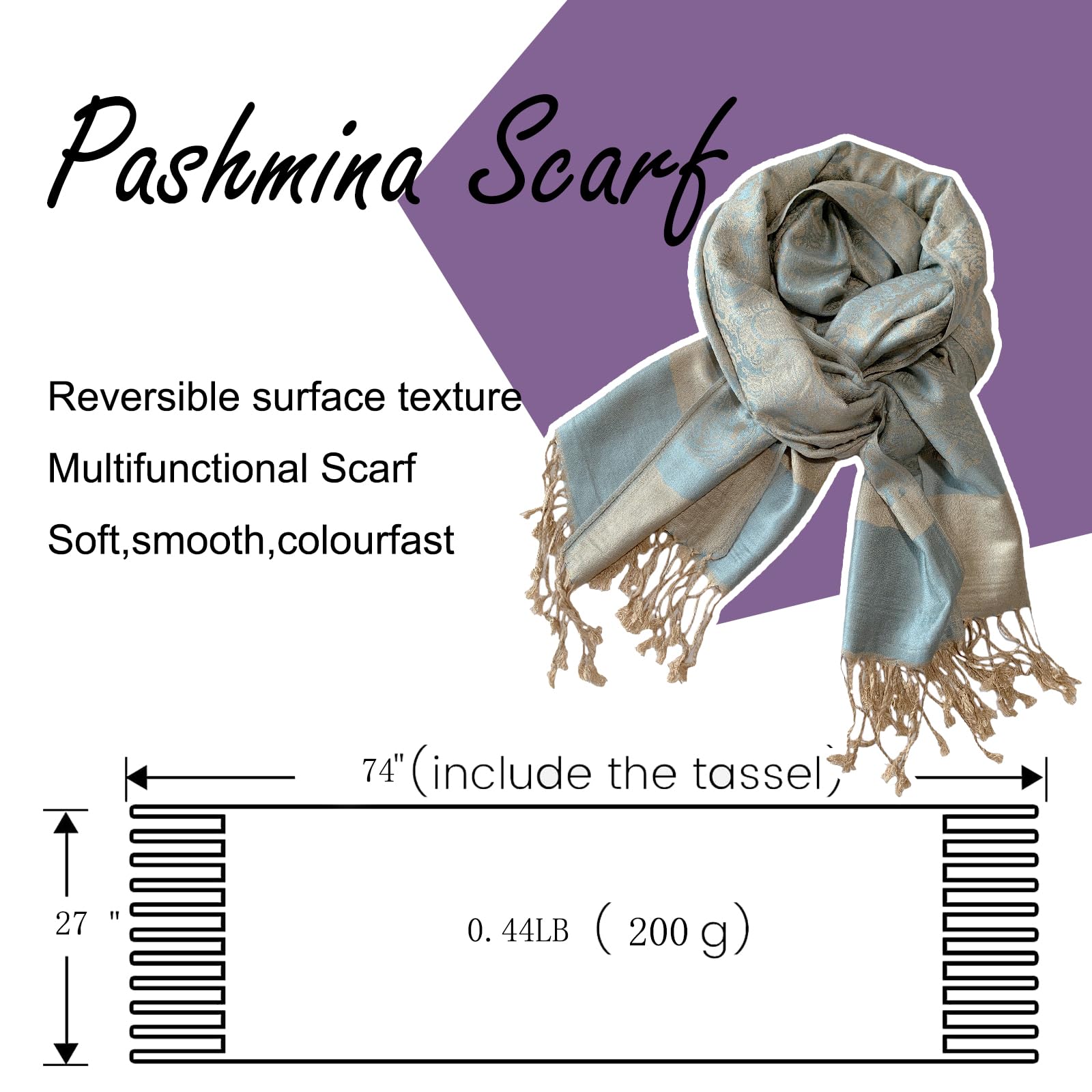 PASHMINA SCARF SIZE : 74"(L) x 27"(W) Fringe Size : ( 3" tassels on each side)