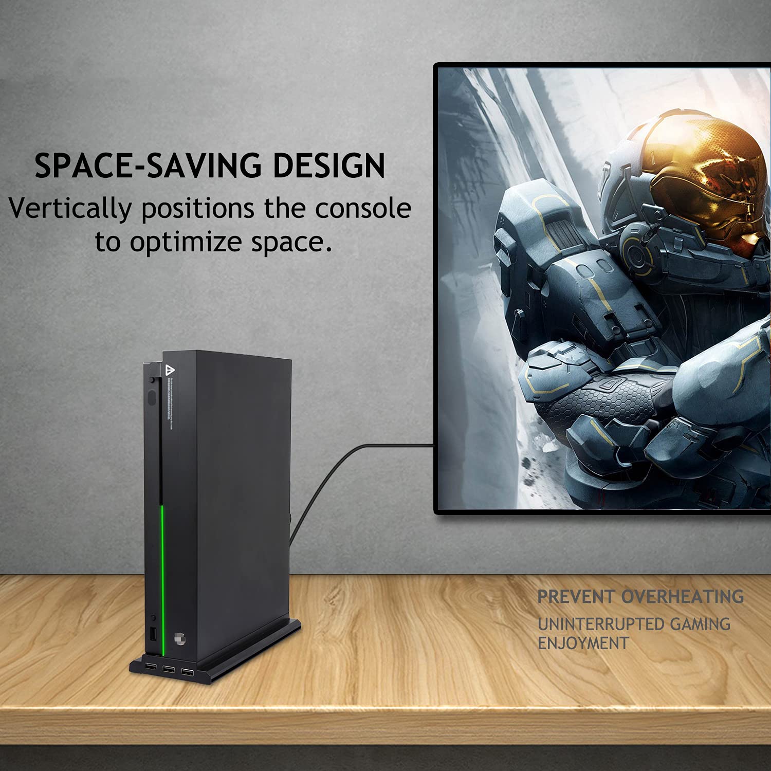 3 IN 1 FUNCTIONS - Vertical Stand compatible with Xbox One X & Game Console Cooler Dock & 3 USB HUB Charger Ports(Controllers and console no included.)