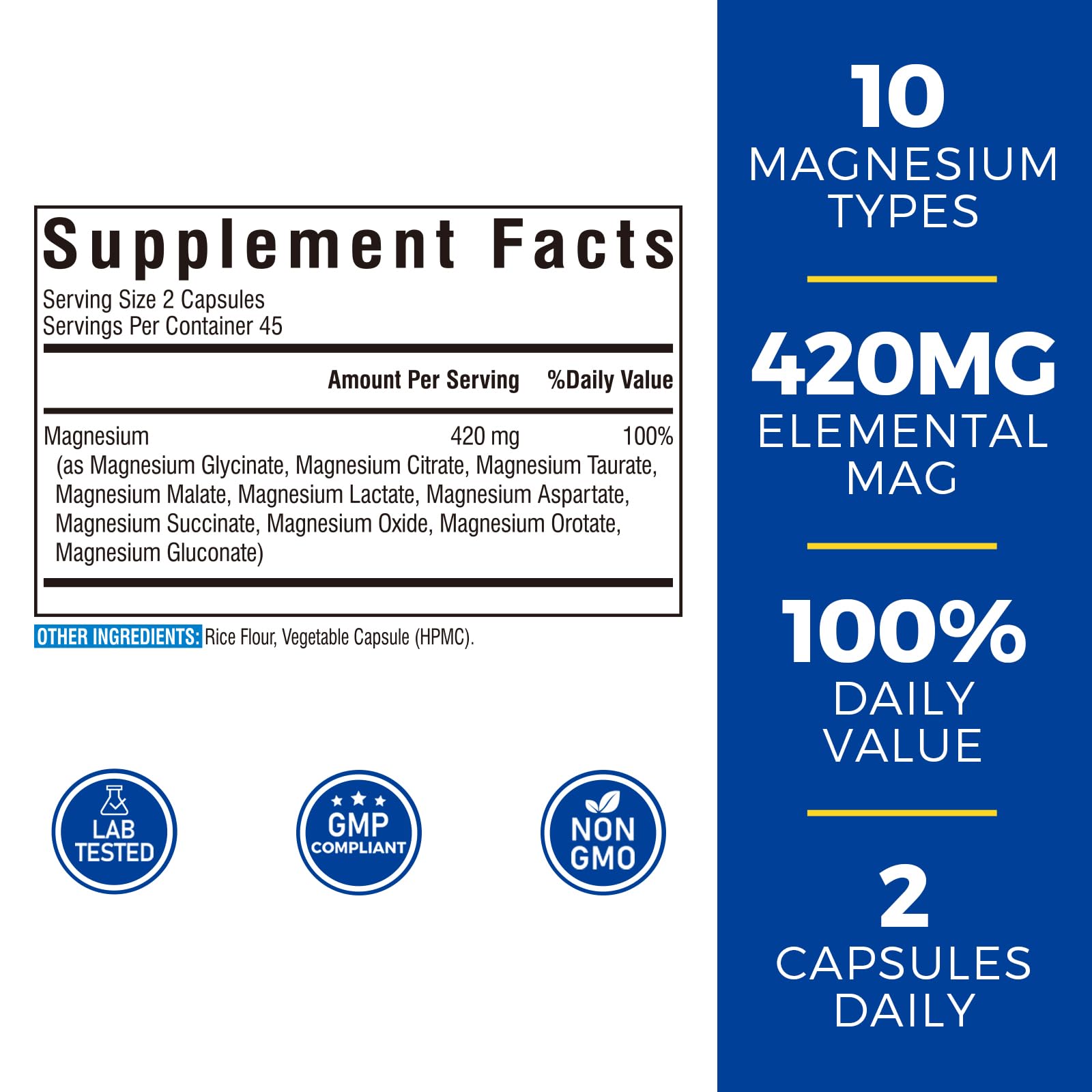Comprehensive 10-Type Magnesium Blend: Say goodbye to magnesium supplements only offering a single magnesium compound and simplify your daily health routine! Our all-in-one formula contains 10 full spectrum types of magnesium in each capsule to provide all the magnesium you need in one supplement, making it a more convenient and cost-friendly choice