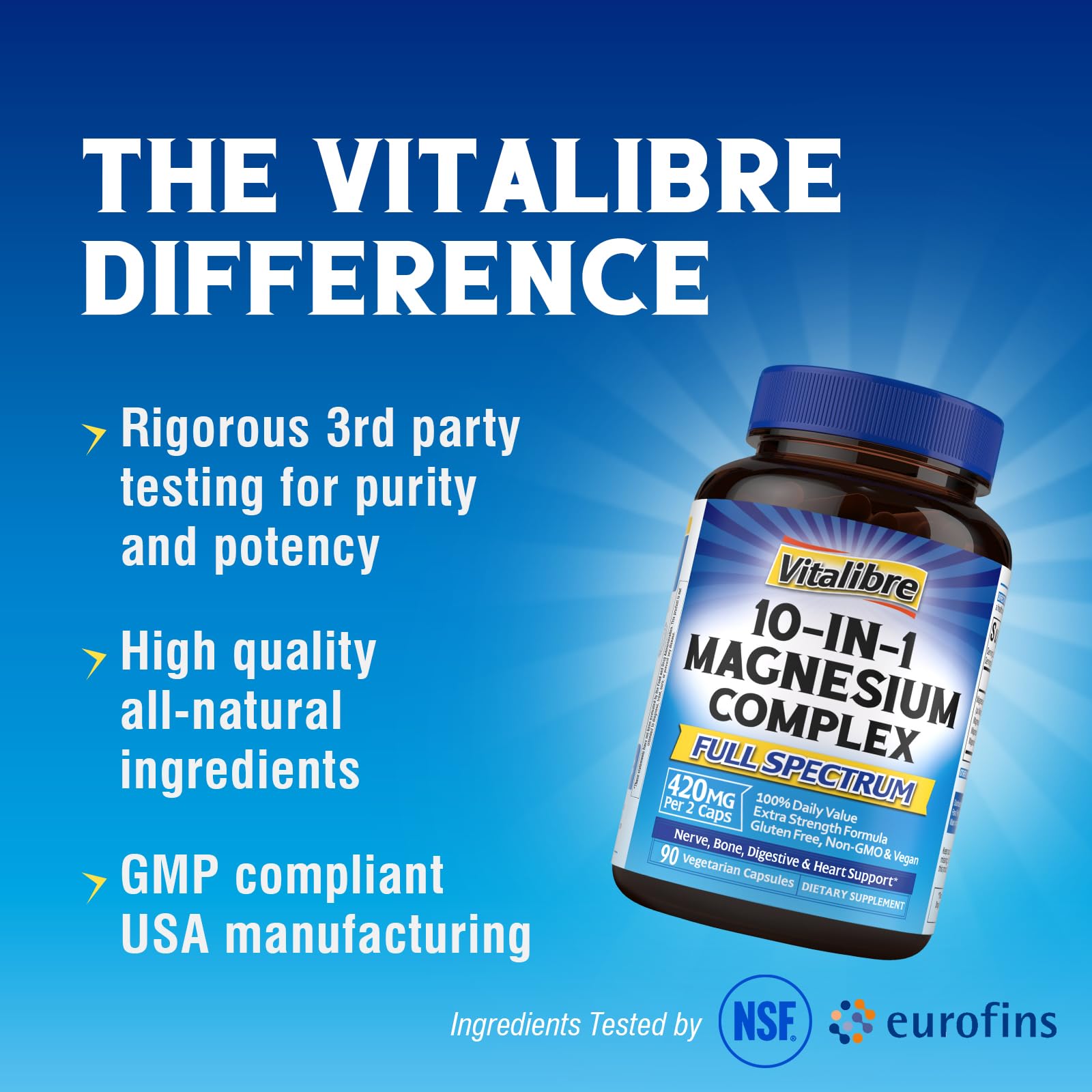 Supports Total Body Health*: Vitalibre 10-in-1 Magnesium Complex delivers a broader range of health benefits to help improve your common everyday health struggles.* Magnesium glycinate complex promotes nerve relaxation for tranquil sleep and brain health, supports bones healthy for improved exercise performance & heart health, and maintains a strong immune and digestion system.*