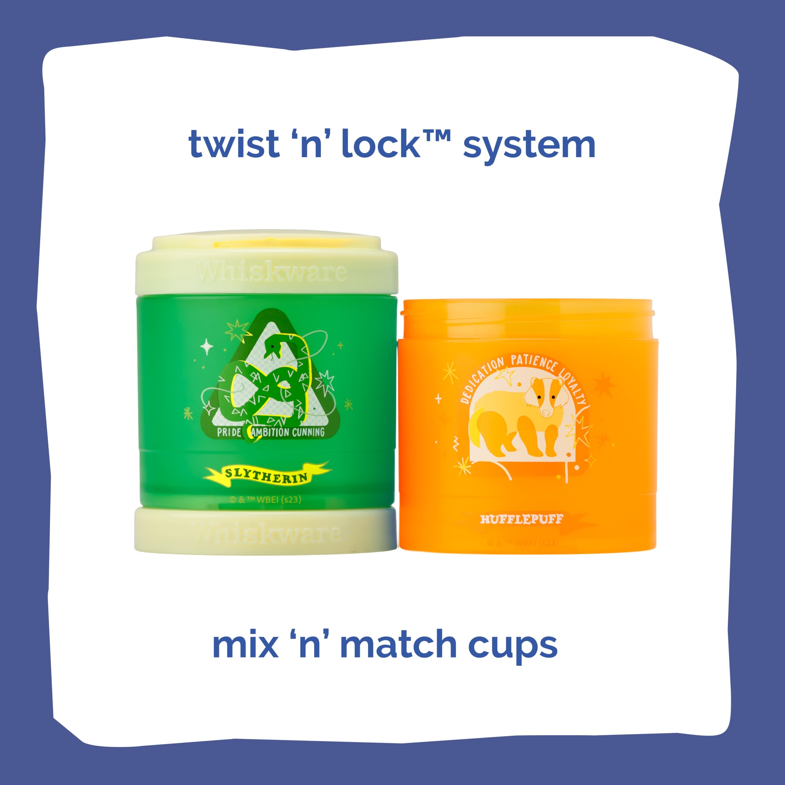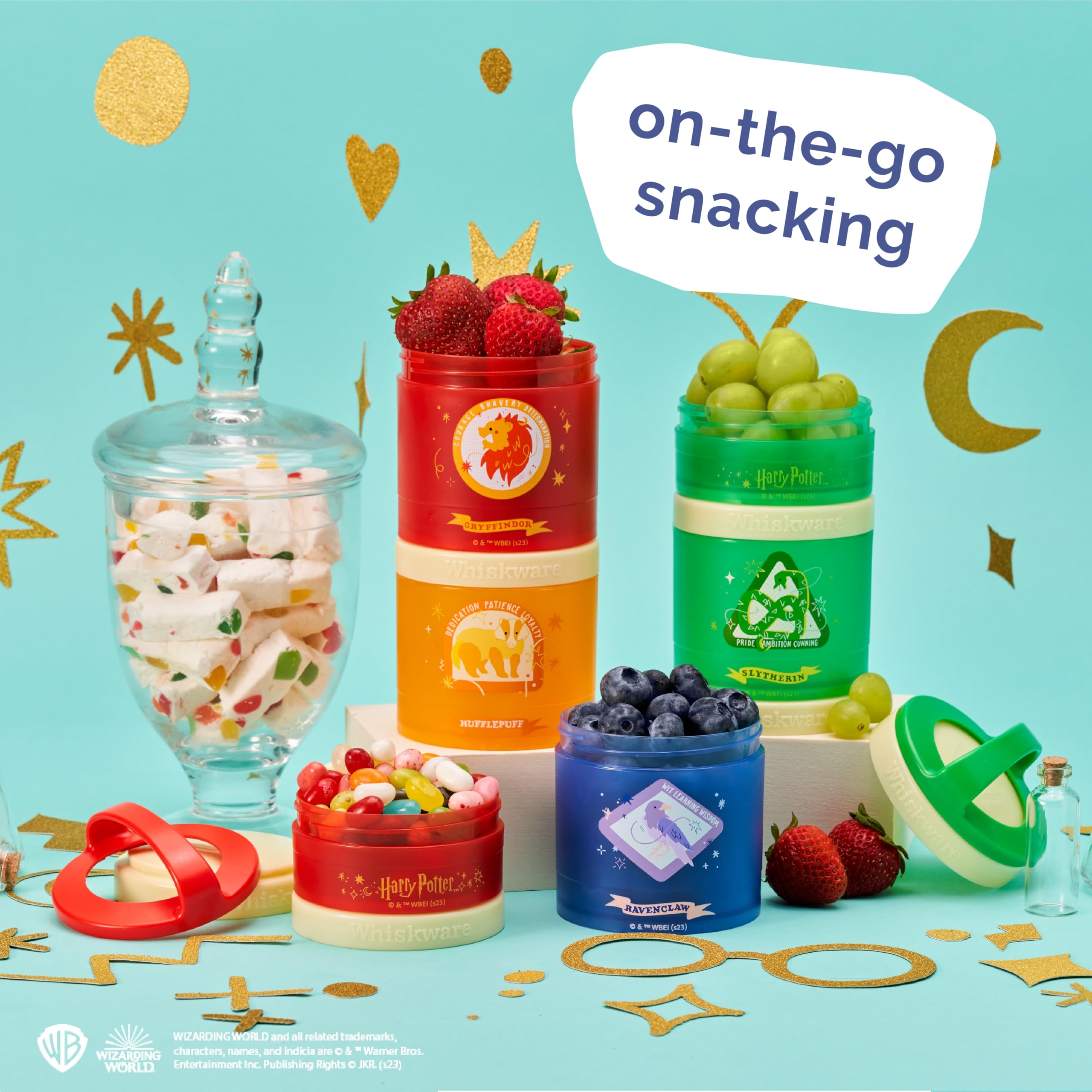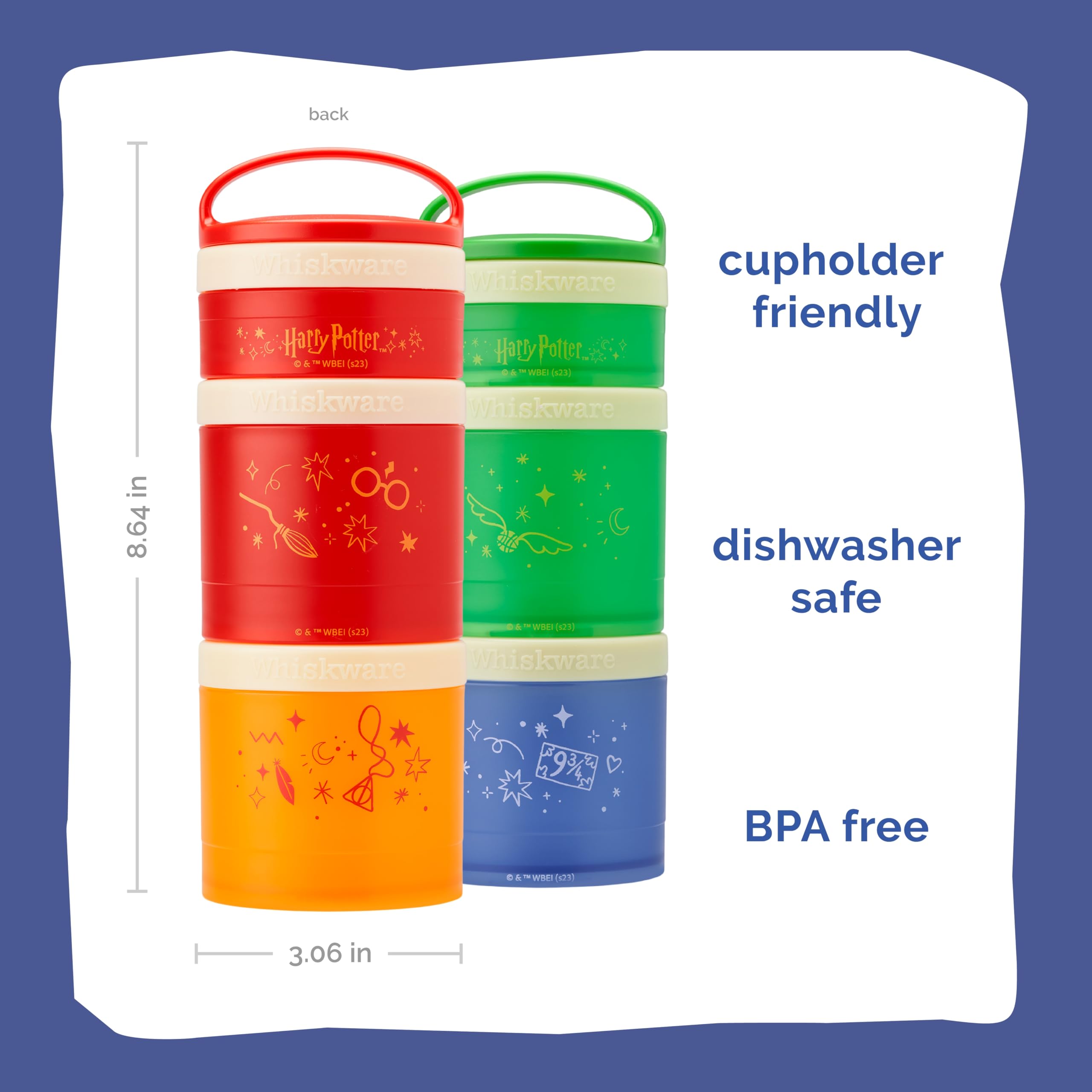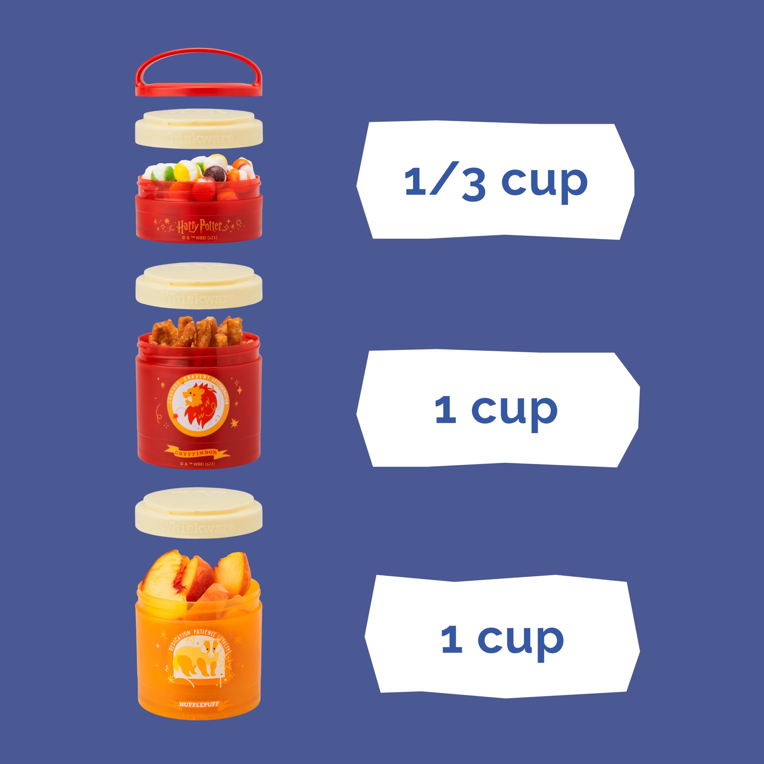 Enter the Wizarding World with Whiskware Stackable Snack Packs! Harry Potter icons Dumbledore and Hedwig, Hermione, Harry Potter, Voldemort, Snape, Hagrid, Dobby, and Harry Potter Glasses are represented on versatile, stackable containers—perfect for on-the-go snacking. Each set comes with three dishwasher-safe jars: 1/3 cup, 1 cup, and 1 cup. Jars can be used on their own, or easily connected to each other with the quick twist Twist 'n' Lock system. Removable carrying handle makes it easy to carry the stack, or clip to a bag. Perfect for fruits, veggies, crackers, mixed nuts, toppings, and other snacks. BPA- and phthalate-free; dishwasher and freezer safe..