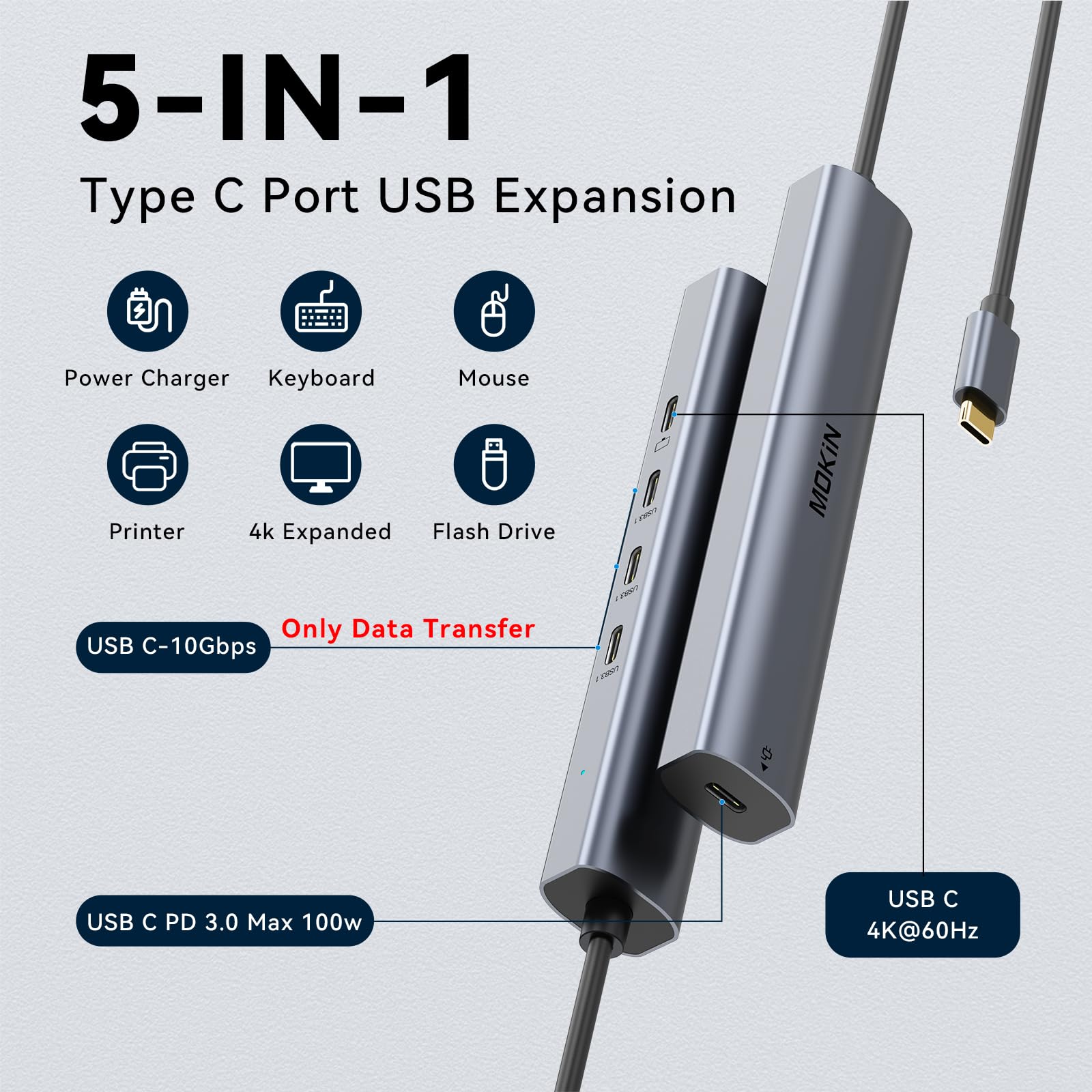 【5-in-1 USB C HUB】Expand your connectivity with this high-performance 10Gbps multiport adapter. It features 1USB4 DisplayPort (4K@60Hz, 10Gbps data transfer), 3USB-C 3.1 ports (10Gbps data transfer), and 1*100W Power Delivery port for fast laptop charging. Enjoy quick file transfers and seamless backups with just one single connection