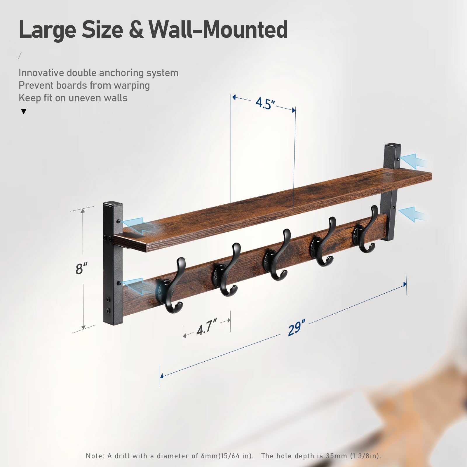 【29inch Large Wall Shelf Storage】2 in 1 wall hooks with shelf have functions both hang & display; The shelf for wall wide enough to display books, frames and vases; Suitable for living room,laundry room,bathroom and kitchen, etc.