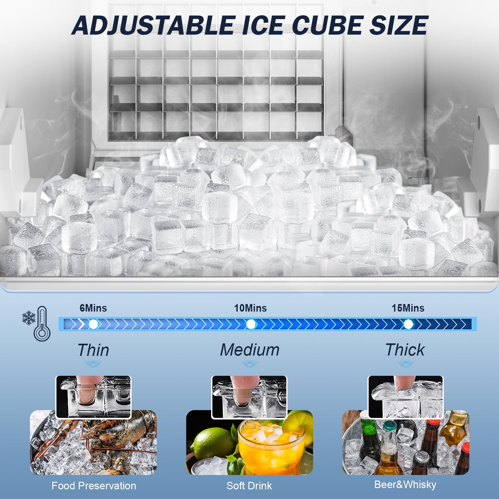 【Customizable Ice Thickness】:Savor the adaptability of our ice maker, offering a choice of thin, medium, or thick ice cubes. Ideal for cooling beverages or maintaining the freshness of food items, our ice is crafted in block form for maximum cooling efficiency. With a simple touch, you can also enjoy nugget ice for a refreshing twist in your drinks. Experience the premium of personalization with this under-counter ice machine