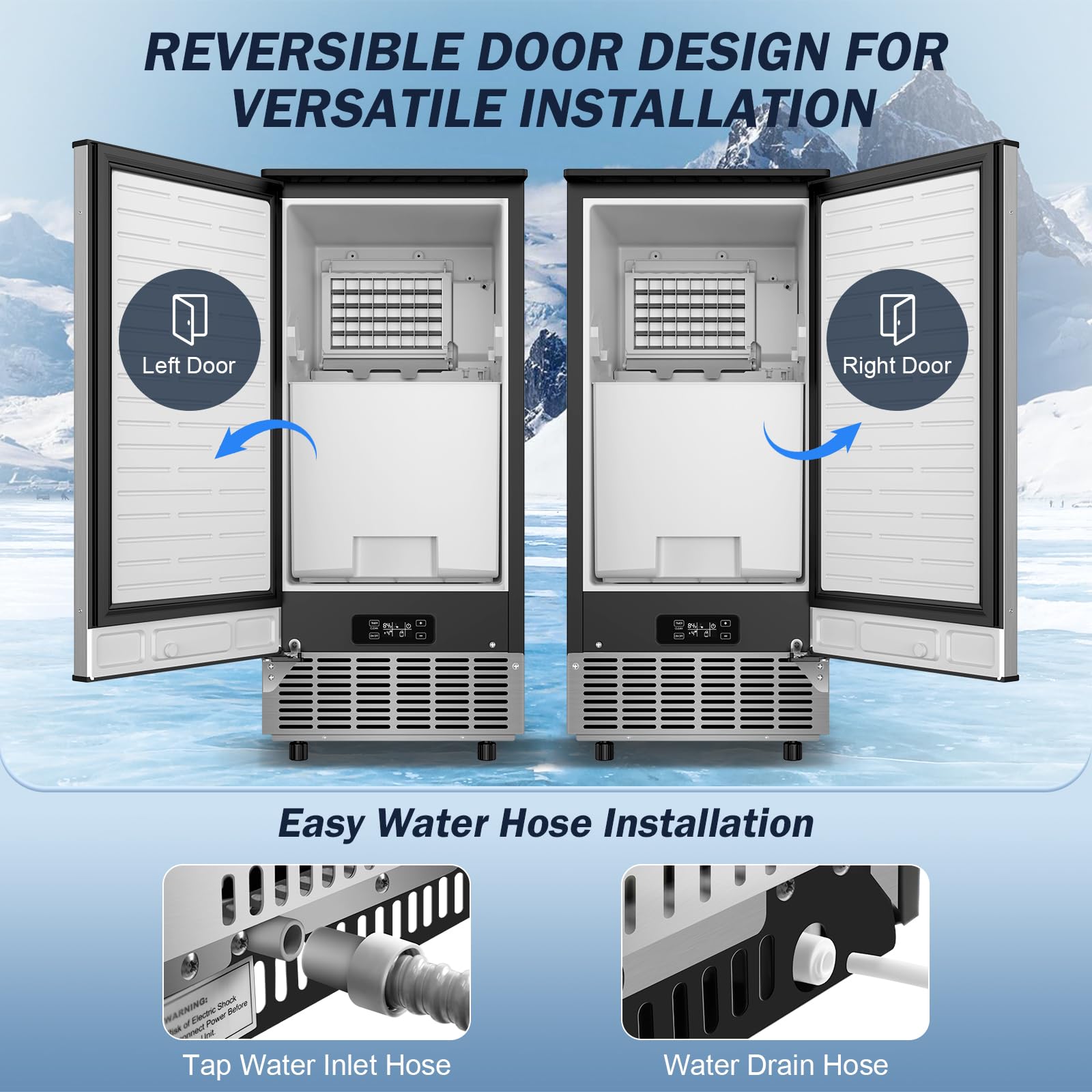 【Universal Design Flexibility】:Designed to fit seamlessly into any space, this standalone ice maker can be placed under the counter or used as a freestanding unit. The reversible door adapts to left or right opening preferences, ensuring a harmonious fit with your kitchen or bar setup. The adjustable feet provide stability on uneven surfaces, making it the perfect ice-making addition wherever you need it