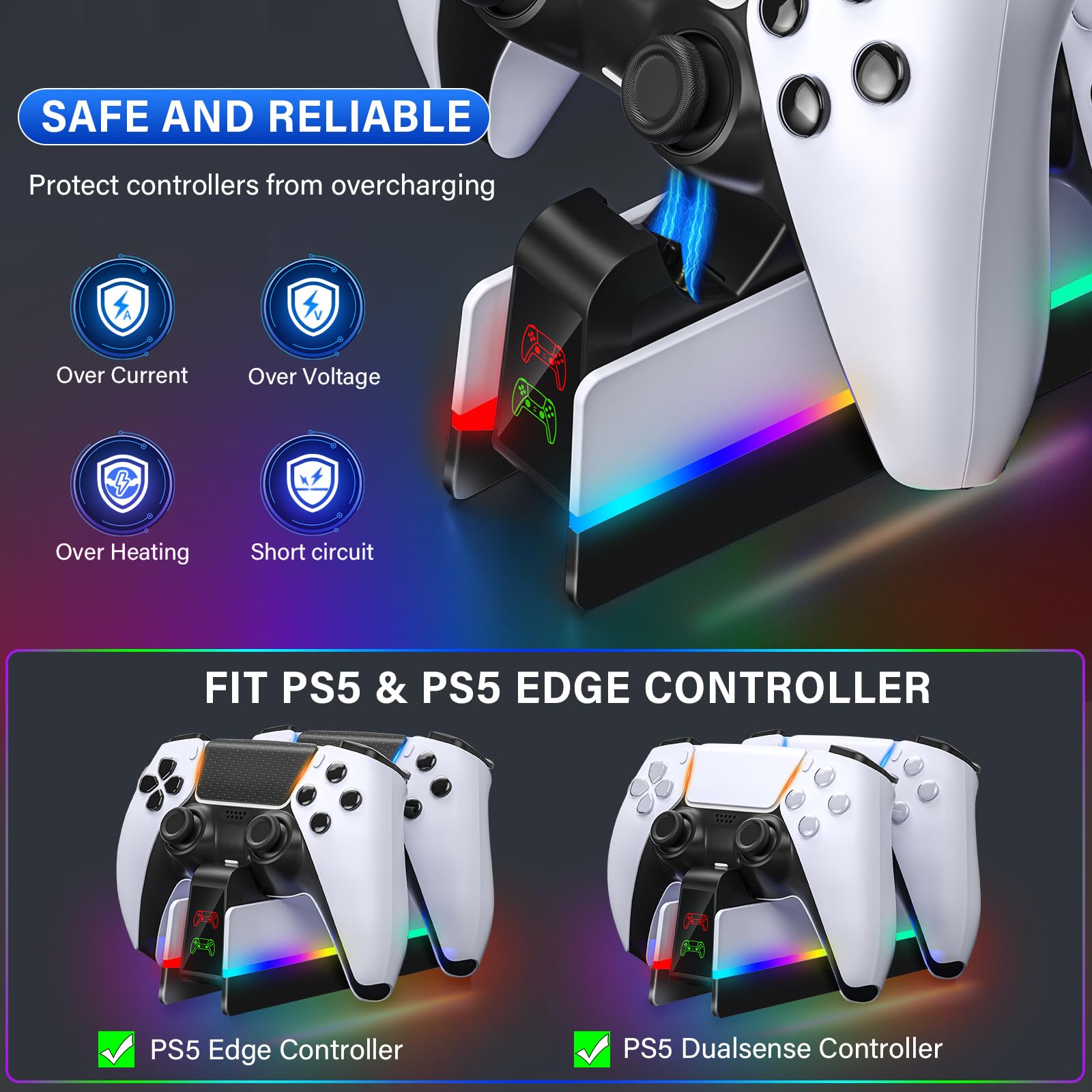 SAFE CHARGING & RELIABLE PS5 Controller Dock: This ps5 charging dock protects the ps5 controllers from over-charge, over-heating, over-voltage, over-current, and short circuit, and the built-in anti-overcharge chip will stop charging ps5 controllers when the battery level reach 80%, no need to worry about leaving dualsense controller on the ps5 controller charger station overnight