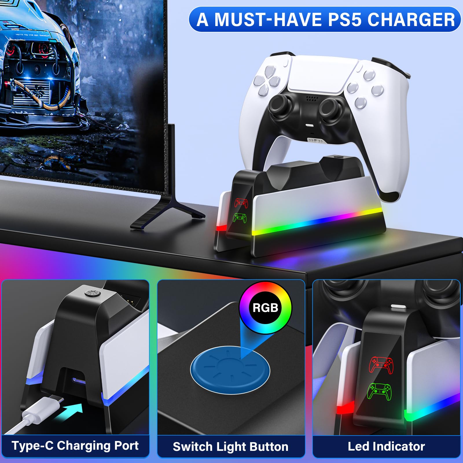 A PS5 Charger More Than A PS5 Controller Stand: The wireless ps5 controller charger can serve as a controller stand to be as a safe storage holder to store the controllers and save space for your game area. 4 non-slip mats are designed at the bottom of the PS5 charging dock to make the charging process more securely. WHAT YOU GET? 1x PS5 controller dock, 1x Type-c cable, 1x User Manual, 1 YEAR SUPPORT