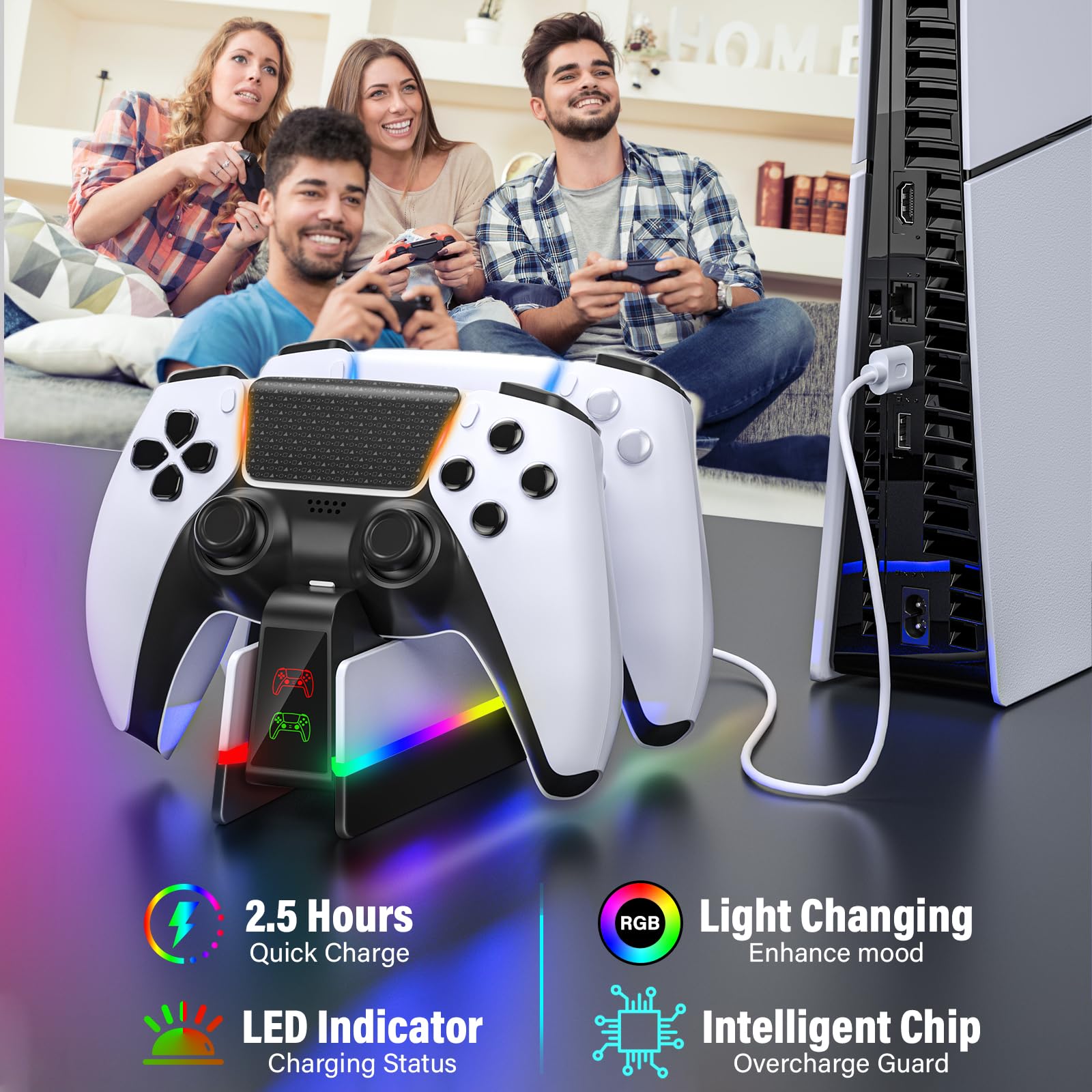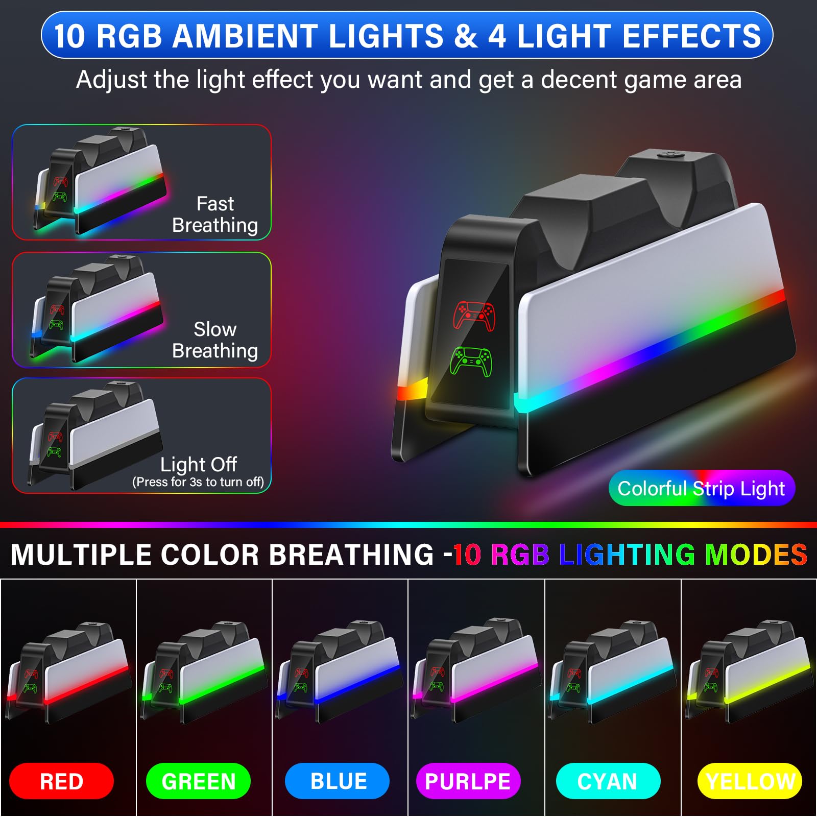 DELICATE & DAZZLING 9 LED Colorful Light: The ps5 charger is designed with both LED strip lights which impart interest or zest for your gaming area. 9 LED ambient lights & 4 light effects are offered for you to select: 7x Fixed Color, Fast Colorful Breathing light, Slow Colorful Breathing light, and Colorful Strip Light. A light switch can turn on/off the light if you need