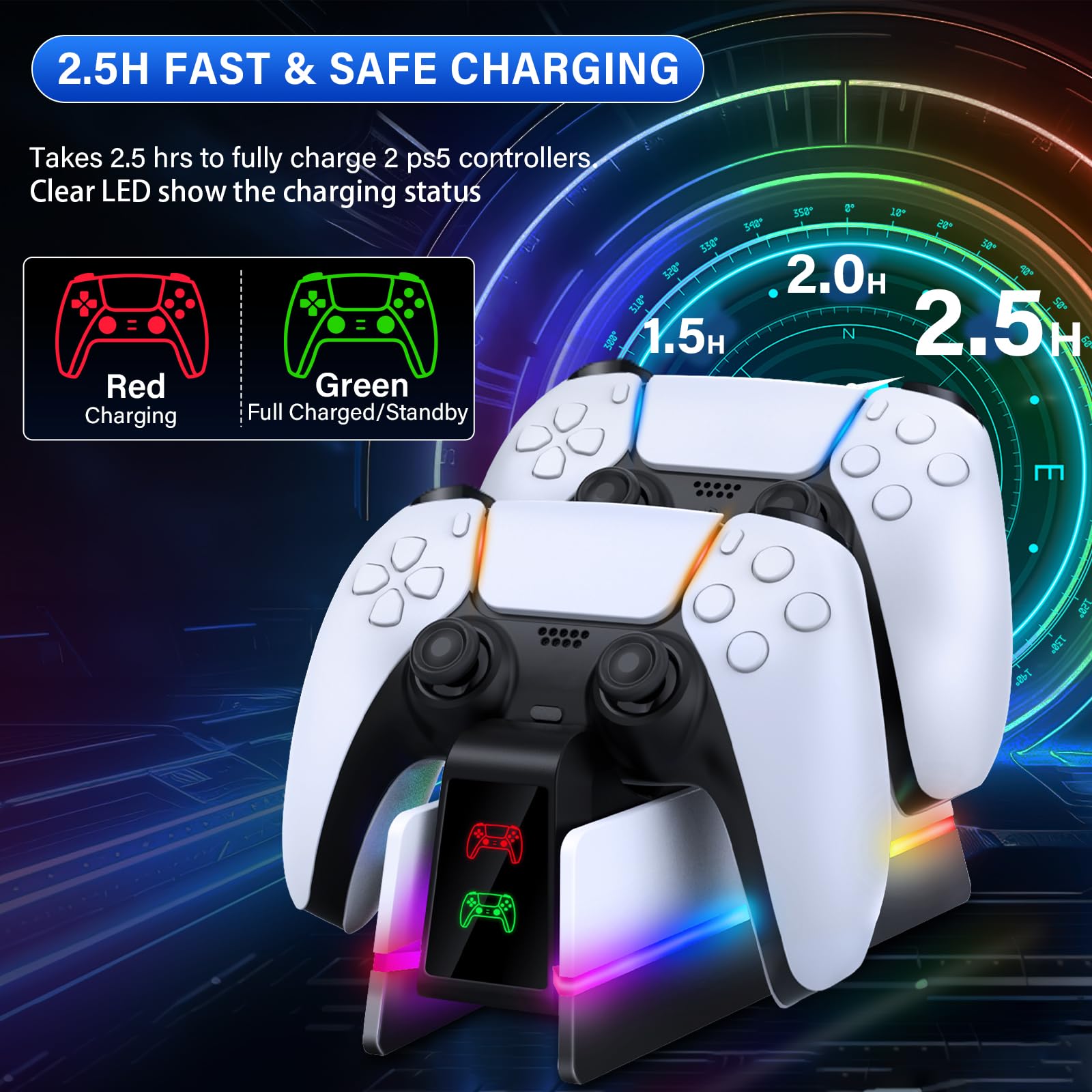 2.5Hrs FAST SPEED PS5 Charger: The upgraded and sensitive charging interfaces of this PS5 controller charger are perfectly adapted to the PS5 / PS5 Slim / PS5 Pro Dual sense & Edge controllers with safety and stability. This ps5 charger station provides a fast charging speed to fully charge two ps5 controllers in 2.5 hours which saves your time and avoids being interrupted by dead controller batteries