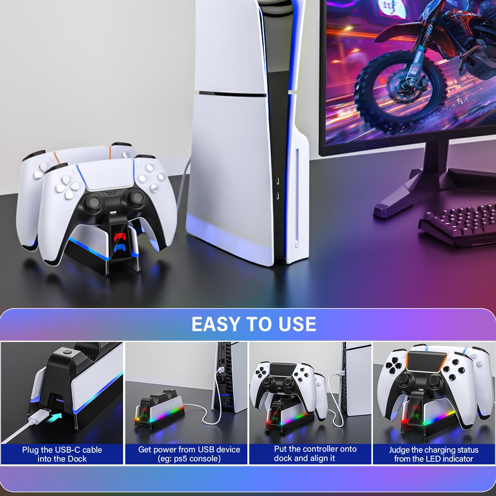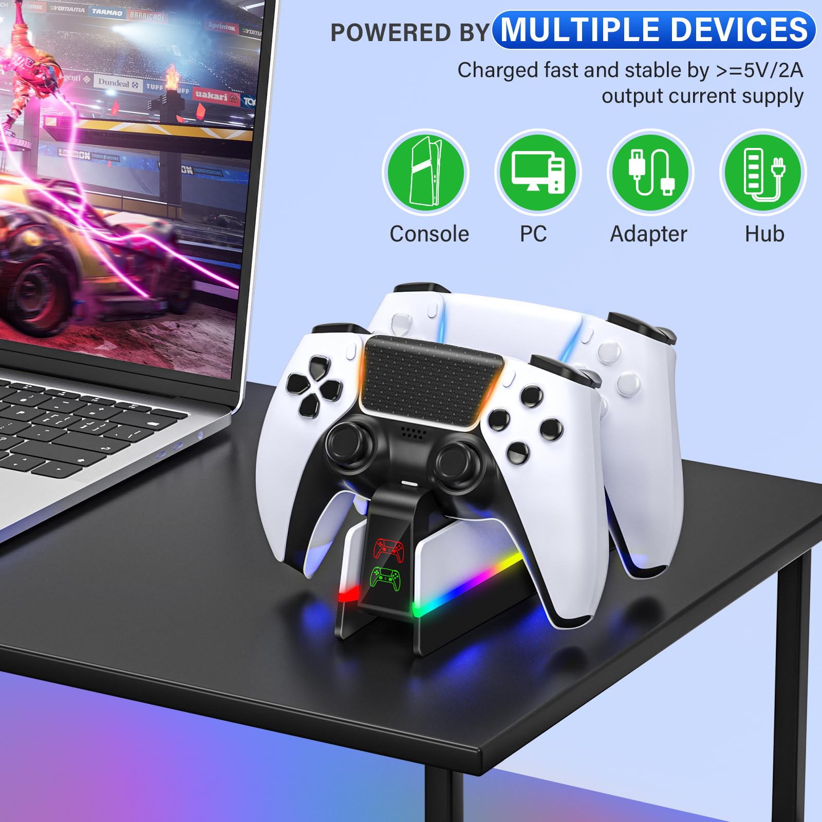 EASY-TO-USE PS5 Controller Charging Station: No more mess ps5 charger cable while battery level of ps5 remote control is low, easily drop and start charging it on ps5 charger station. The compact ps5 controller charging dock can get power through the USB port from the PS5 / PS5 Slim / PS5 Pro console, PC or 5V/2A wall AC power source adapters(wall AC adapter is not included)