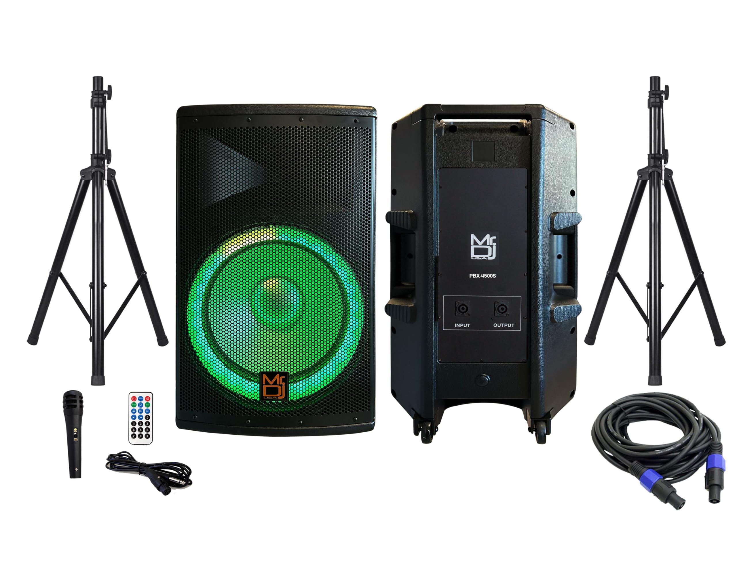 MR DJ USA PBX4500PKG 15" 2-Way PA DJ 4500W Active Powered Bluetooth Karaoke Speaker LED Lighting & Passive Speaker + Speaker Stands & Cable