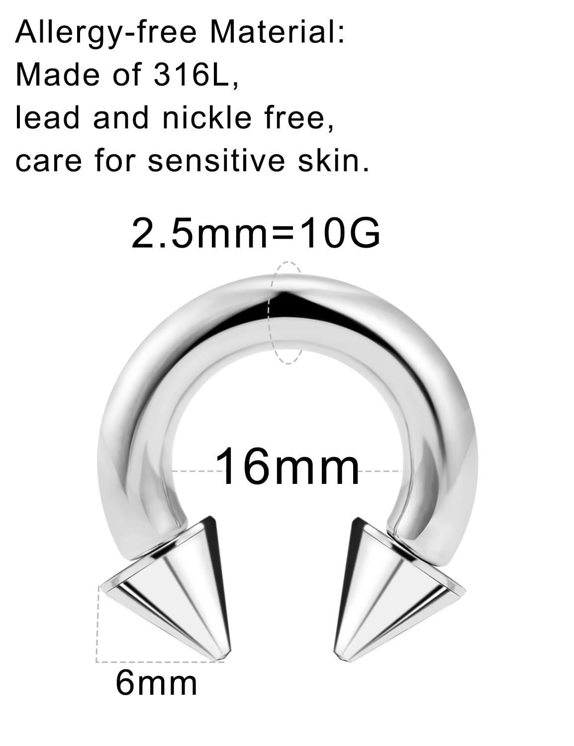 Thickness: 10G (2.5mm); Spike Diameter: 6mm; Inner Diameter: 16mm (5/8inch); Color: Silver-tone.