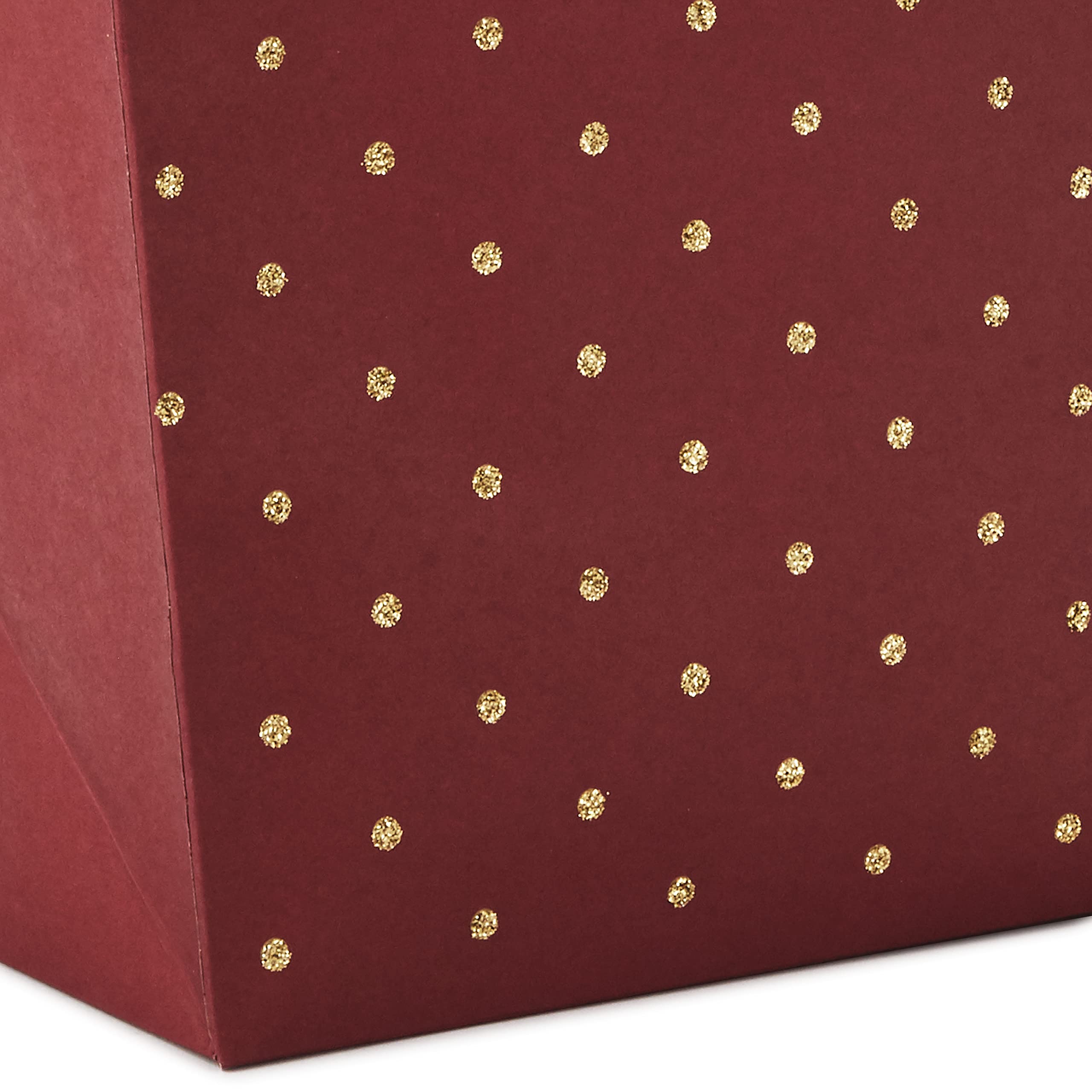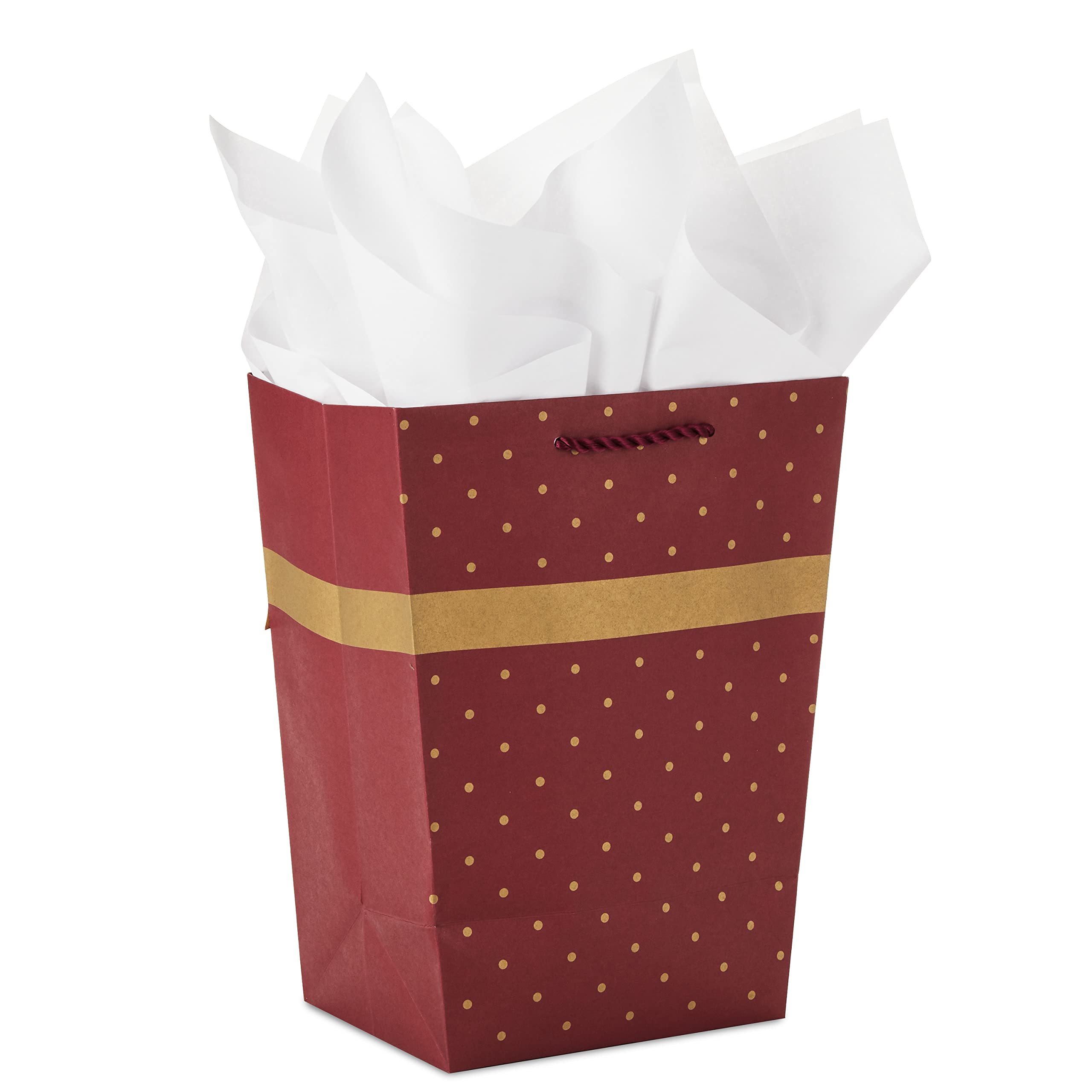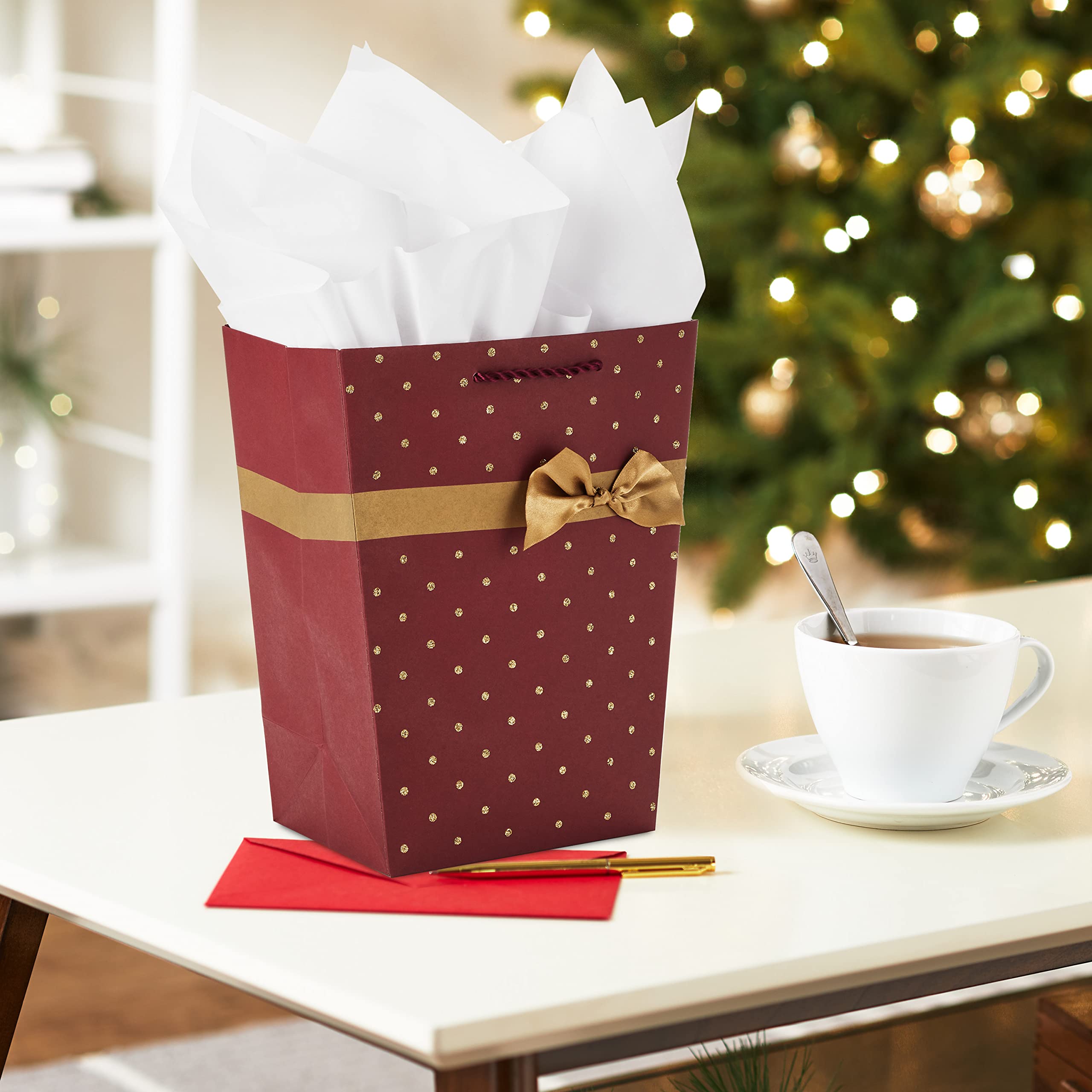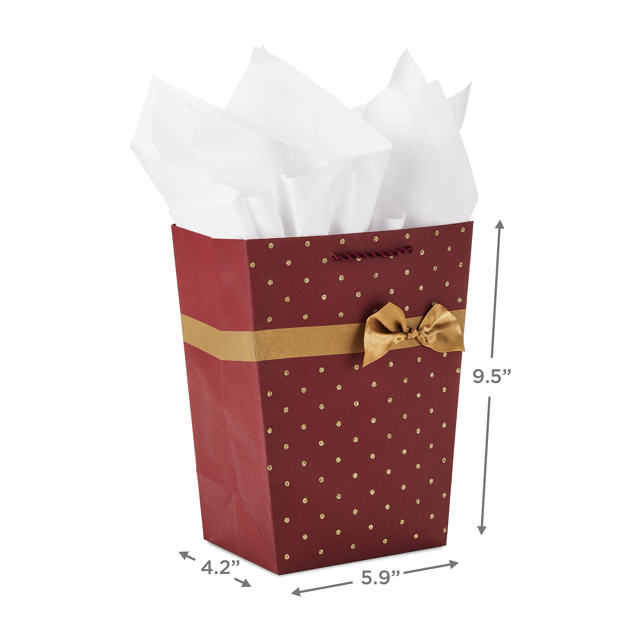 Joy to your world. Add a little magic to your holiday memories with an elegant Christmas gift bag with tissue paper. Red trapezoid gift bag features gold glitter, coordinating handles and gold ribbon with bow. Purchase includes 2 sheets of white tissue paper to make wrapping presents quick and easy. The Hallmark brand is widely recognized as the very best for greeting cards, gift wrap, and more. For more than 100 years, Hallmark has been helping its customers make everyday moments more beautiful and celebrations more joyful.
