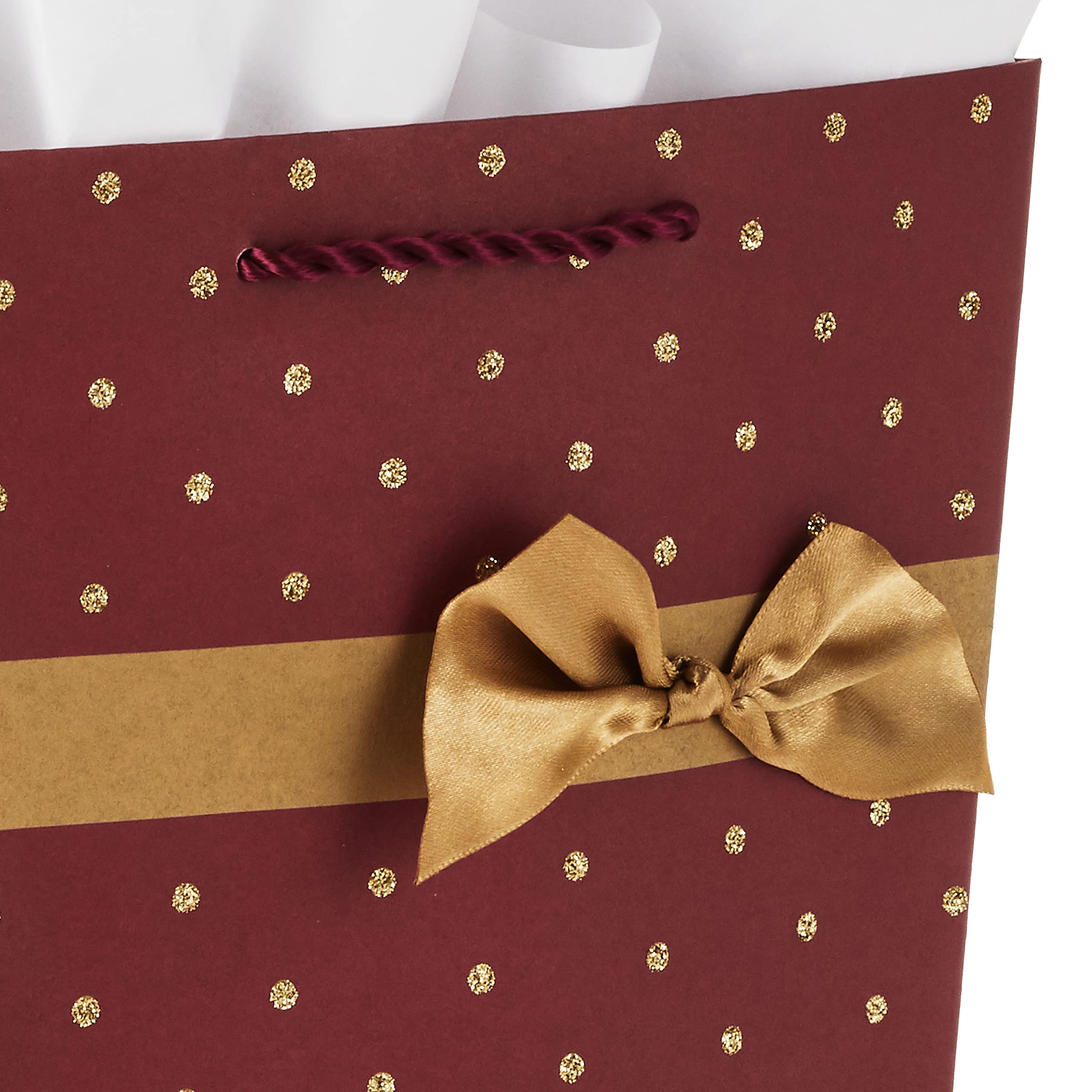 ELEGANT DESIGN: Sophisticated red gift bag features gold glitter, coordinating handles and a gold satin ribbon and bow around the bag; great for Christmas, weddings, graduations, housewarmings and more