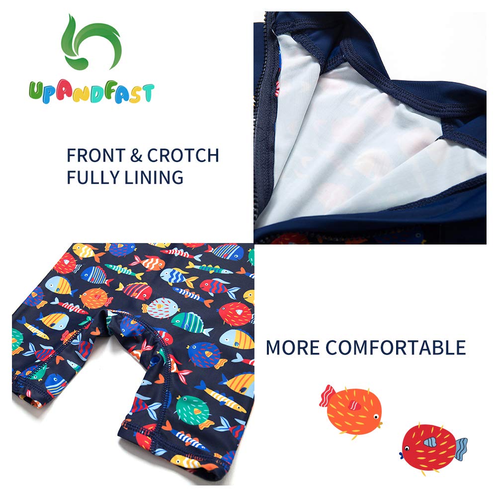 HUMANIZATION DESIGN: This one-piece baby bathing suit has a front / back zip for convenient putting on and taking off. Zipper flap and garage protect your baby's delicate skin
