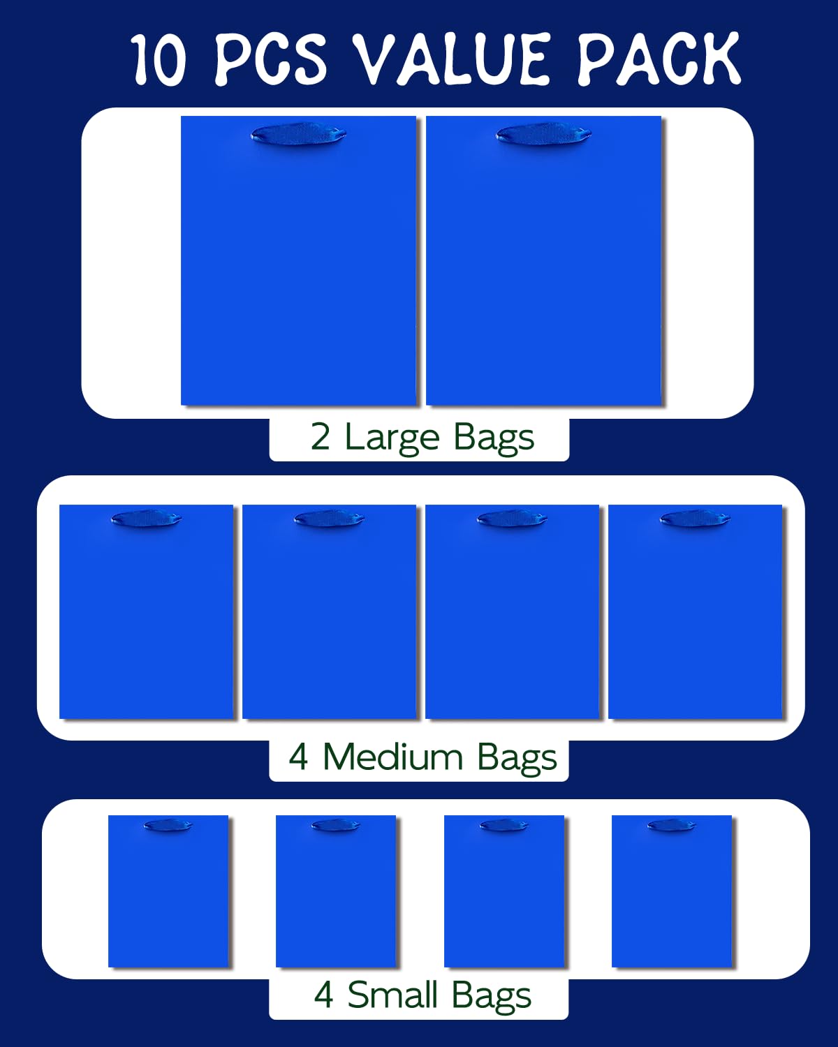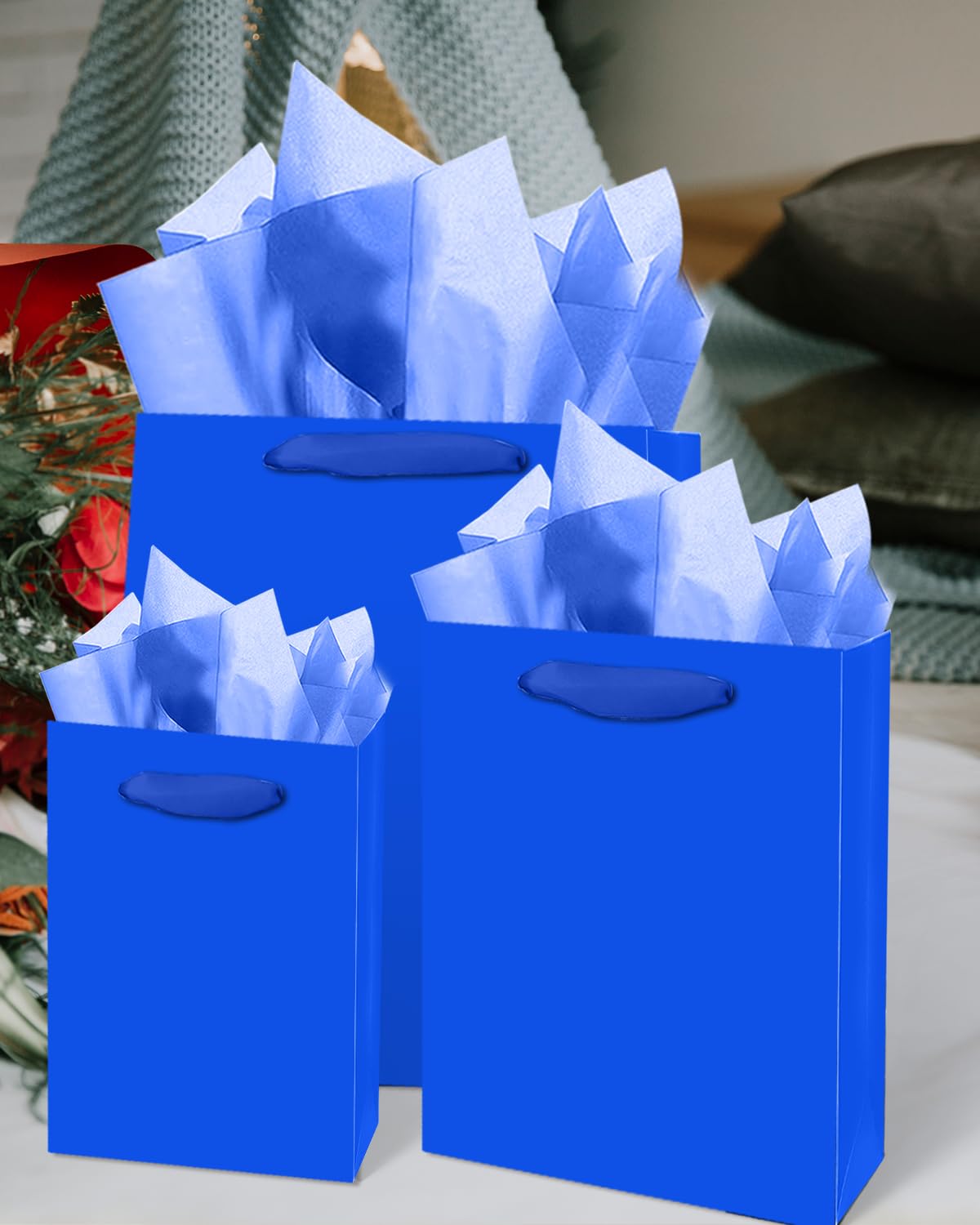 Size-Color: Dark Blue / (2pcs Large 5.5x10.2x13inches, 4pcs Medium 4x7x9inches, 4pcs Small 2.4x4.7x6.3inches ) / 6Pcs Tissue Paper-13.8"x19.7",16Pcs Tissue Paper-9.8"x13.8"