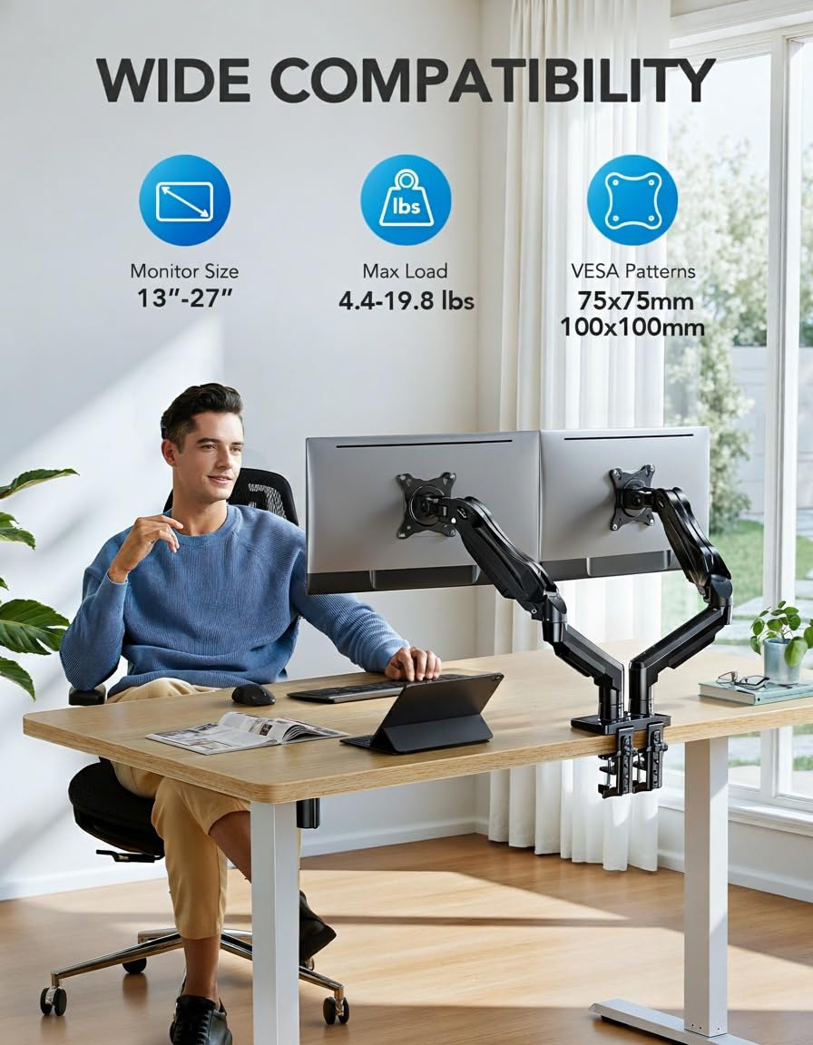 Compatible with Wide Screens - To ensure compatibility with the dual monitor mount, your each monitor must meet three conditions at the same time: First, computer screens size range: 13 to 27 inches. Second, screen weight range: 4.4 to 19.8 lbs. Third, the back of the monitor screen must have VESA mounting holes with a pitch of 75x75mm or 100x100mm.