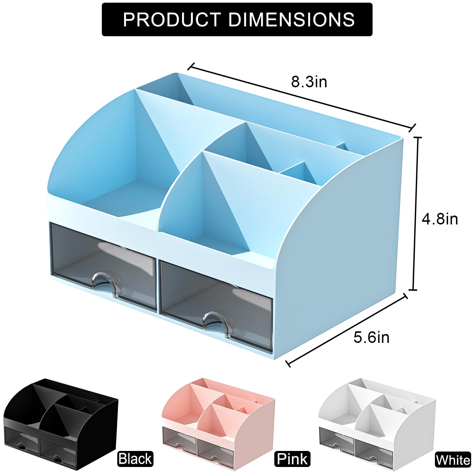 Multiple Storage Spaces: Small body with large capacity, great cosmetic storage countertop assistant contains 6 Sections and 2 drawers, different compartments allow you to place items according to your needs, transparent drawers allow you to quickly find what you need, easy to place and take, the perfect match can let you all the makeup accessories are neatly stored