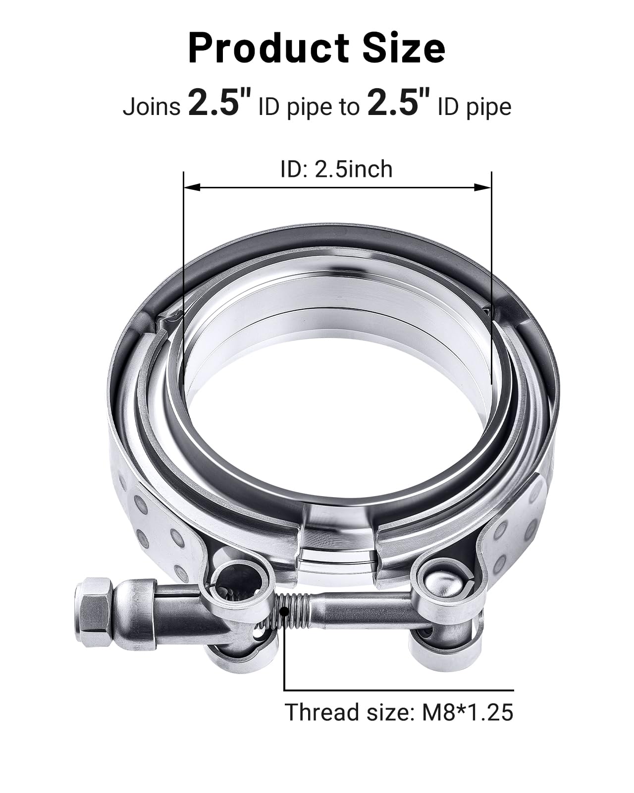 [Size] Joins male/female flange 2.5" ID to 2.5" OD pipe. T-Bolt thread size: M8*1.25.