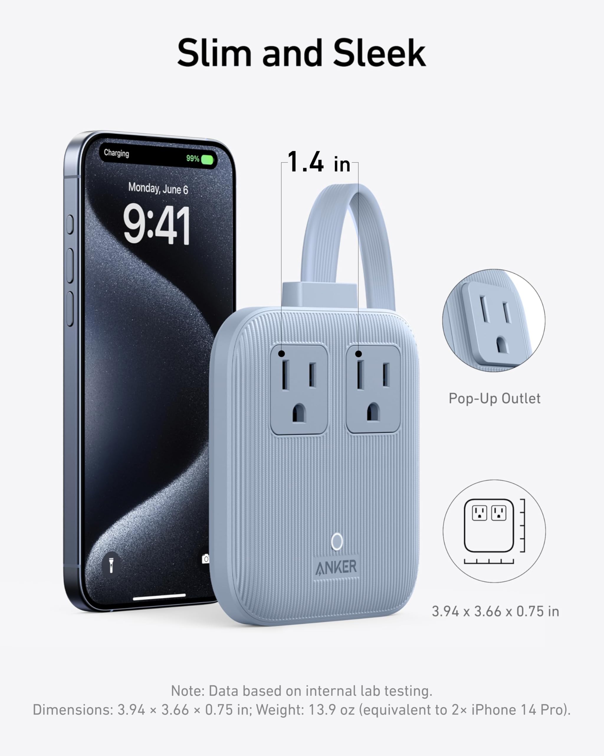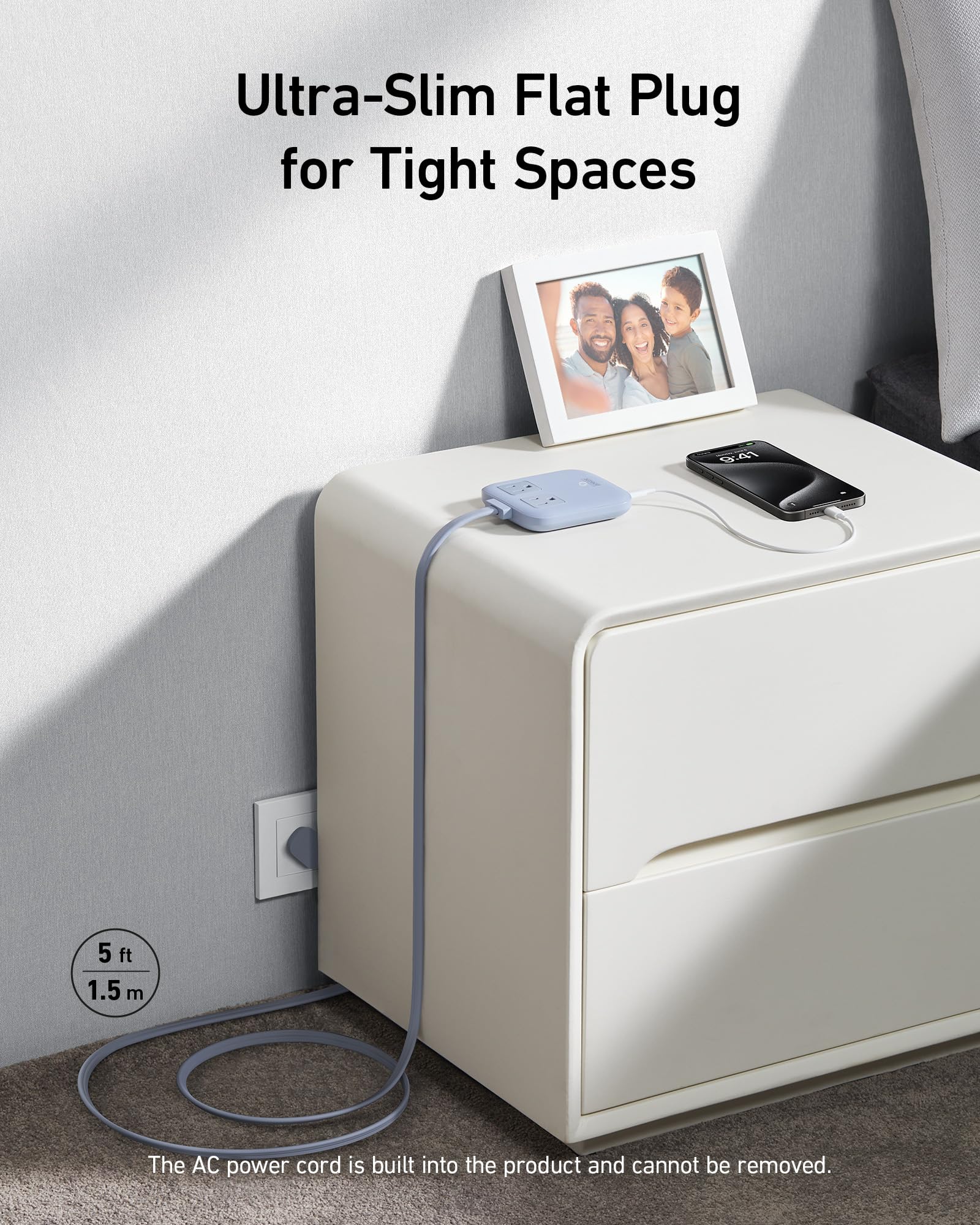 Slim and Space-Saving: Measures 3.94 × 3.66 × 0.75 in (100 × 93 × 19 mm) and weighs 13.9 oz, about the same as two iPhone 14 Pro devices. Features a 0.35" flat plug and 5 ft extension cord, making it ideal for desks, bedside tables, and tight spaces. Note: The AC power cord is not detachable.