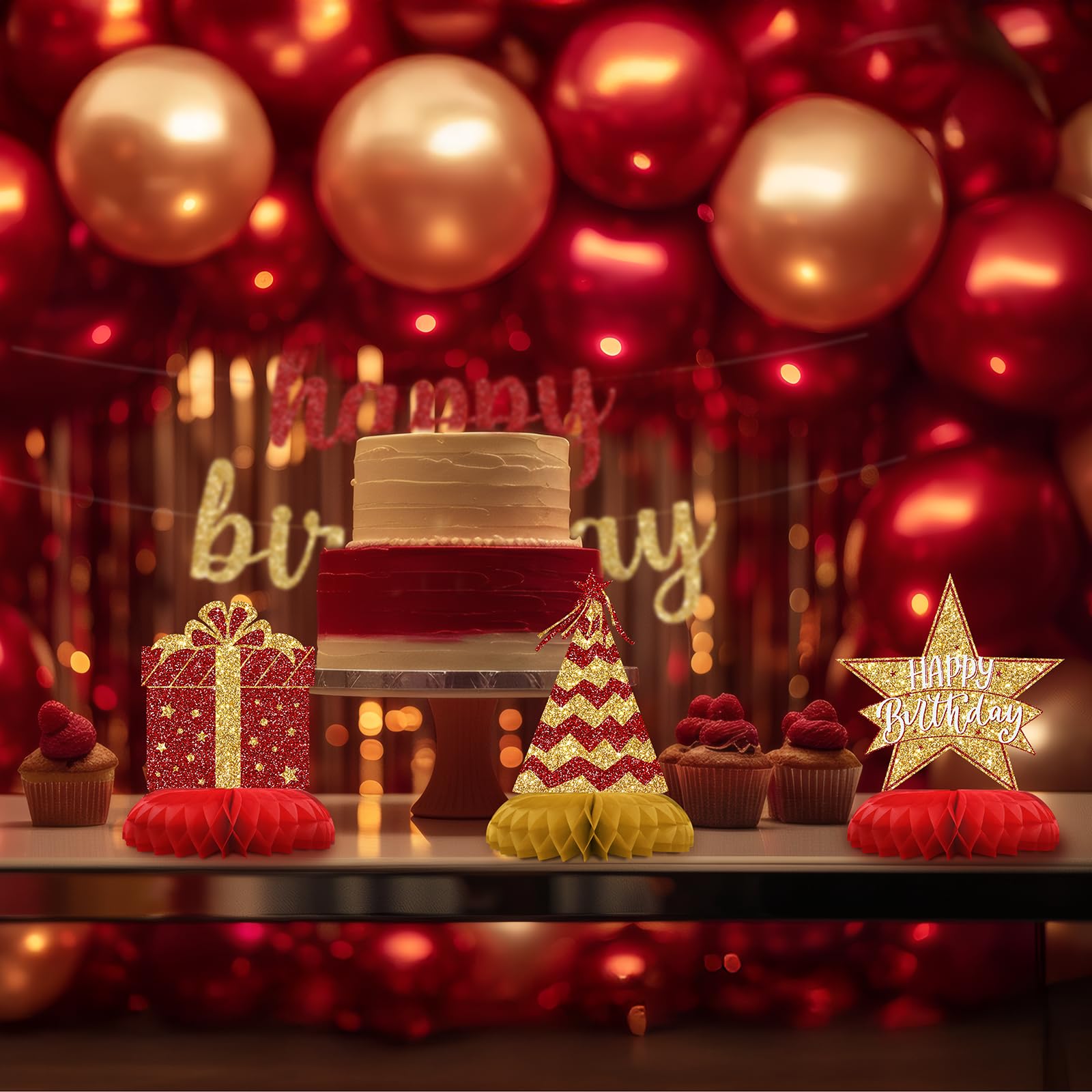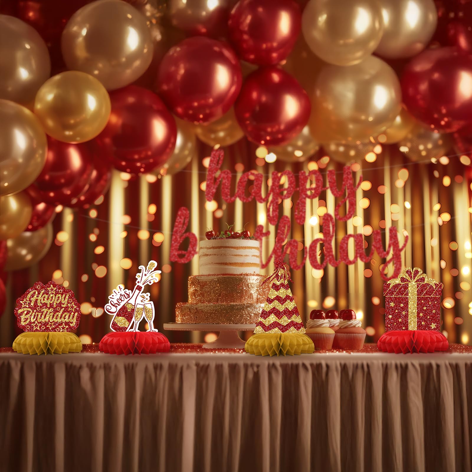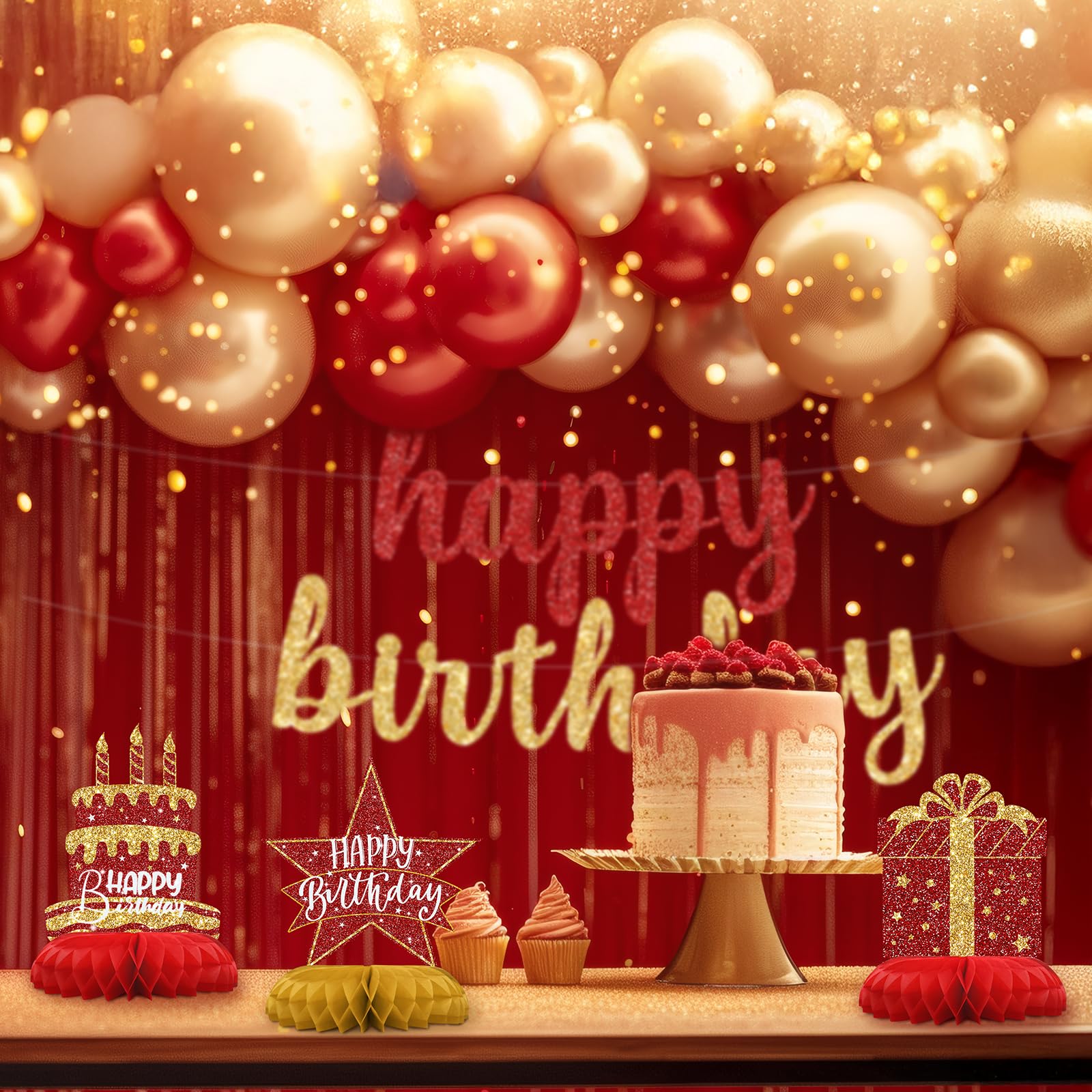 Perfect for Celebrating in Style – These happy birthday table decorations work for men’s birthdays, elegant events, or red-gold-themed milestone parties.