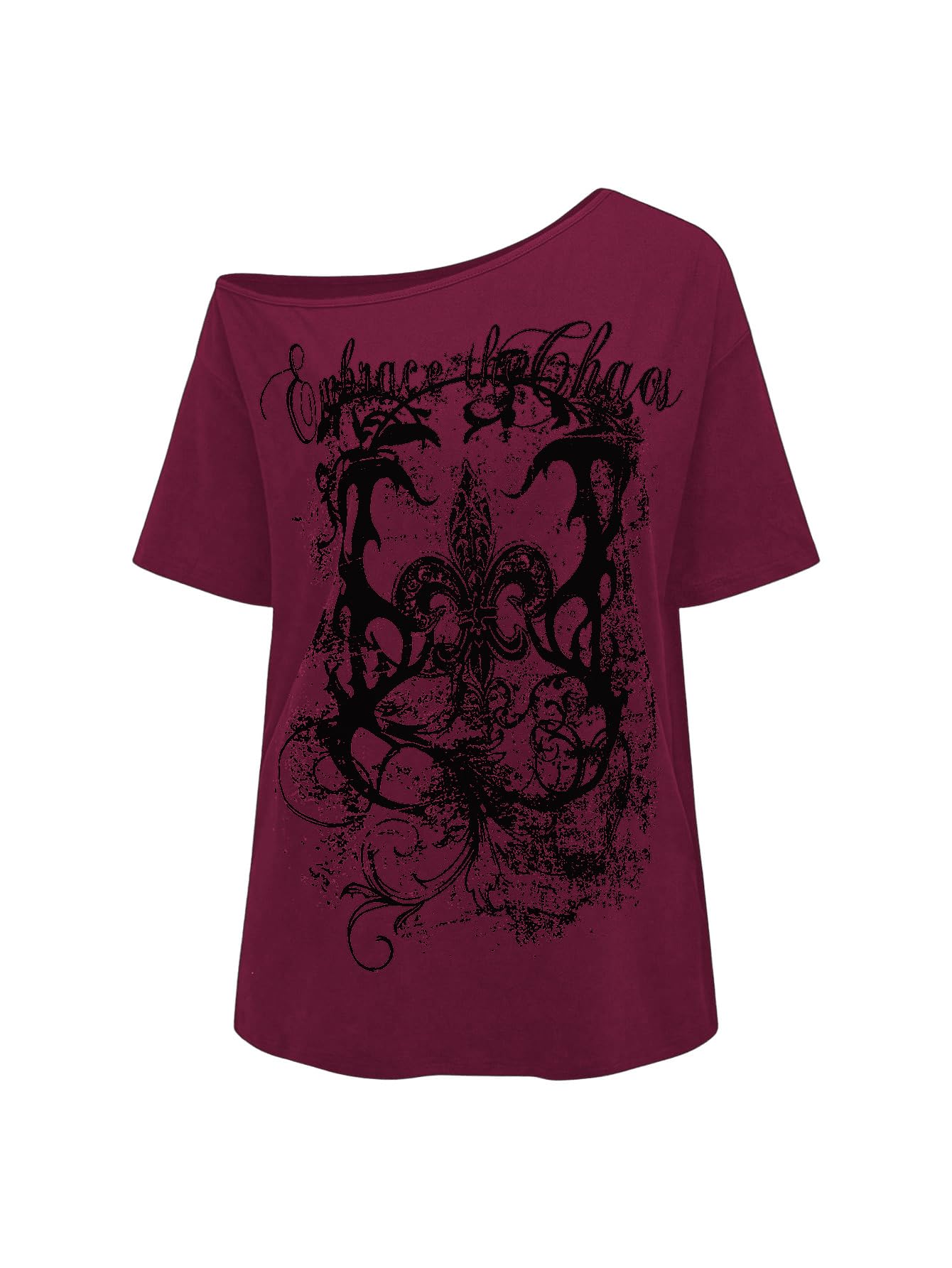 Features: graphic print, halfsleeve, boat neck, drop shoulder, goth tee shirts, y2k trendy tee tops