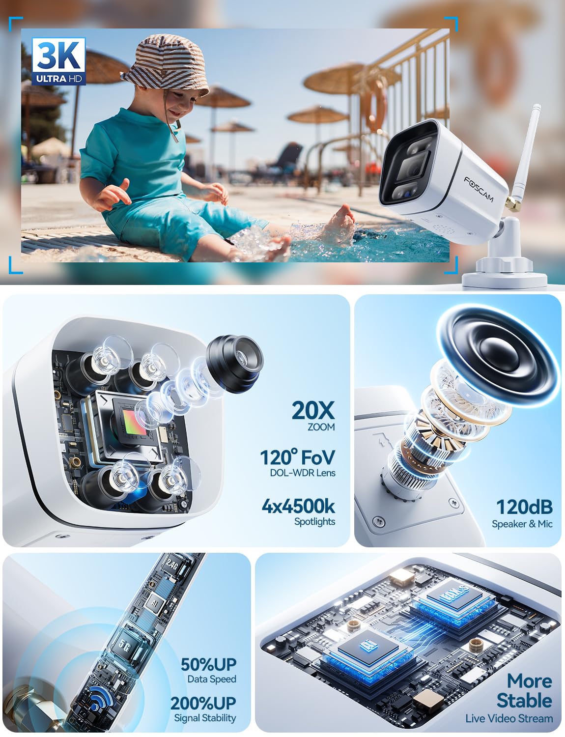 【More Stable by AI 5GHz Chips Connection 】FOSCAM V5P WIFI camera integrates FOSCAM WiFi 5 AI-Enhanced Dual-Band WiFi System for lightning-fast connectivity and stable video streaming on a 5GHz band and dual 2.4GHz band chips, reducing latency by more than 50%. It also strengthens network security with triple data encryption with WPA, WPA2 and WPA3, allowing you to monitor your abode remotely and transfer data securely, be it from the cozy confines of your home or halfway across the globe.
