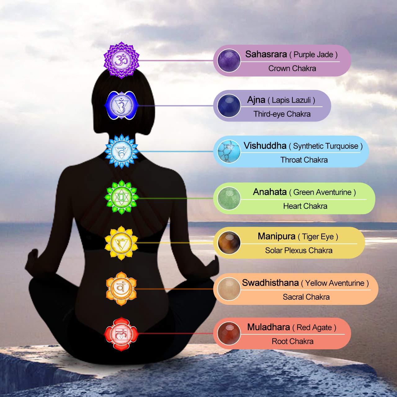 MATERIAL: Natural chakra stone bead(6mm), alloy OM charm; 7 Charka stone include: amethyst, sodalite, green turquoise, dyed green jade, tiger eye stone, yellow aventurine, red agate. come with a easy to store flannelette velvet bag.