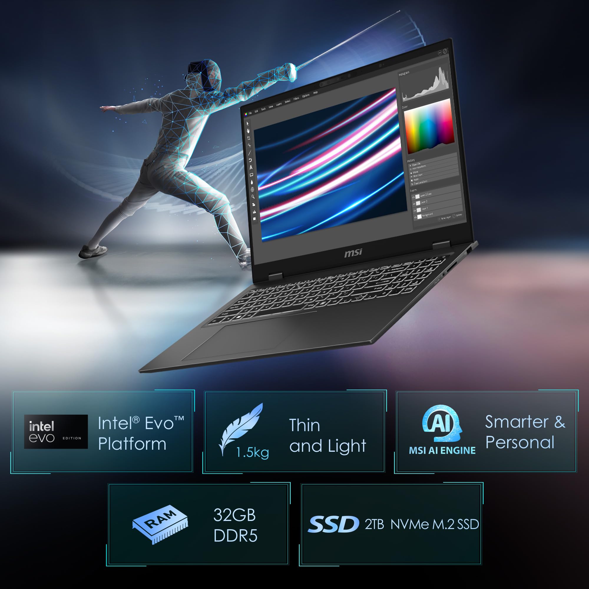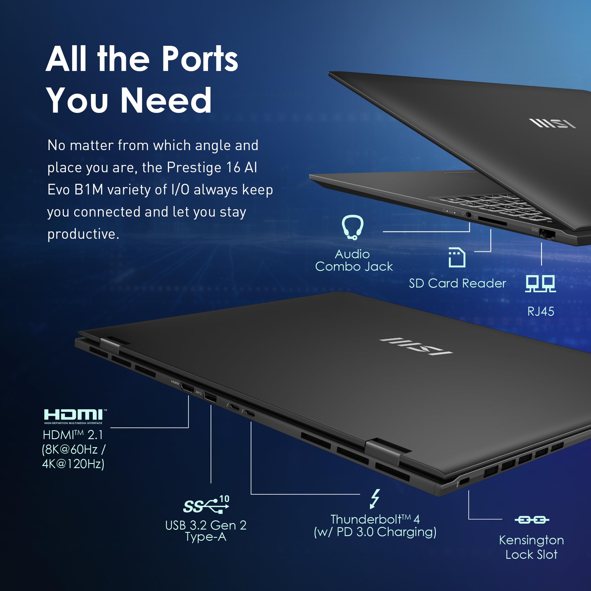 MSI Prestige 16 AI Evo Laptop: Intel Ultra 7-155H, 16" UHD+ OLED Display, 32GB DDR5, 2TB NVMe SSD, HDMI, SD Card Reader, Win 11 Pro: Stellar Gray B1MG-020US