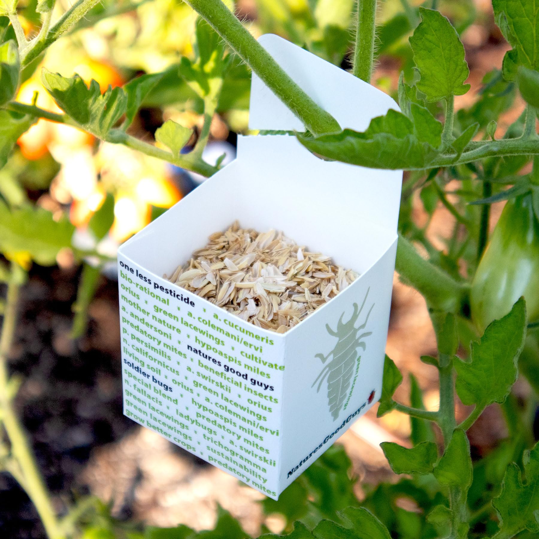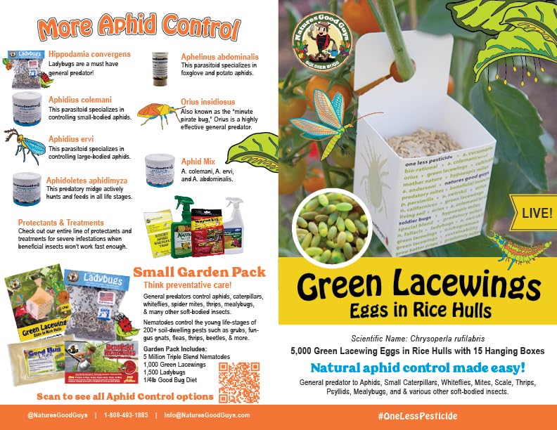Natures Good Guys Green Lacewings Package contains; 5,000 live Green Lacewing eggs Green Lacewings are enemies to; aphids, spider mites, thrips, whiteflies, mealybugs, small caterpillars, eggs of leafhoppers, moths, and leafminers, small caterpillars and beetle larva and other soft-bodied insects. We have an everlasting supply of these ferocious insects. Simply distribute the rice hulls and lacewing egg mixture into the small hanging bags provided then hang the bags. Hang in the shaded part of plant to protect from rain and sun. Nature’s Good Guys, a.k.a Green Lacewings live in a wide range of growing temperatures and humidities. Green Lacewings can be used indoors or outdoors. In orchards, nurseries, greenhouses, gardens, grow rooms, hydroponics! Green lacewings do not migrate, thus making them your best dollar value. General Release: 1-5 lacewing per sq.ft. of planted area. Description: lacewings eggs typically hatch within 7 days, depending on the temperature. Note: You can release lacewings with other beneficial insects like ladybugs and praying mantis!!