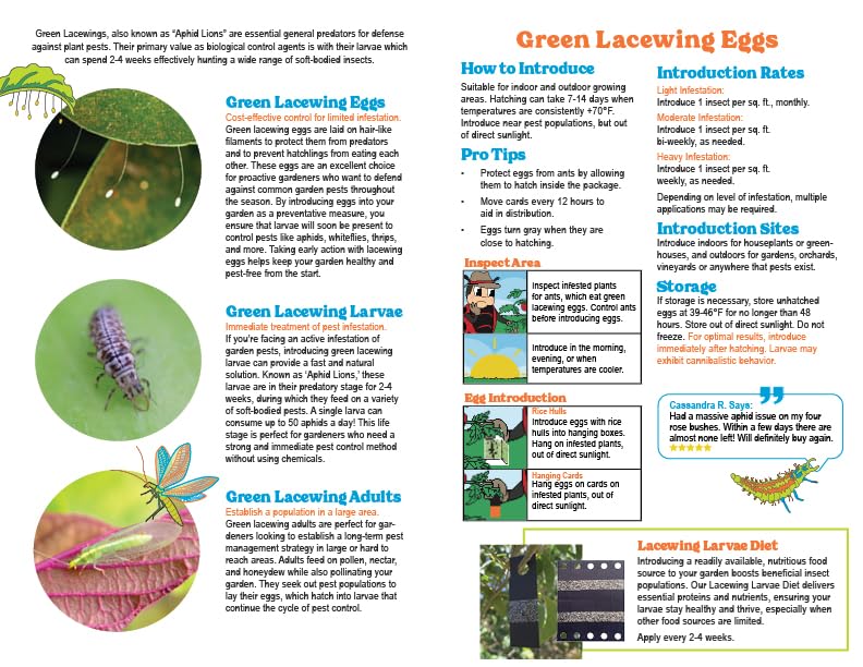 Lacewings are enemies to; Aphids, Leafhoppers, Spider Mites, Mealybugs, Thrips and other Soft Bodied, Slow moving insects.
