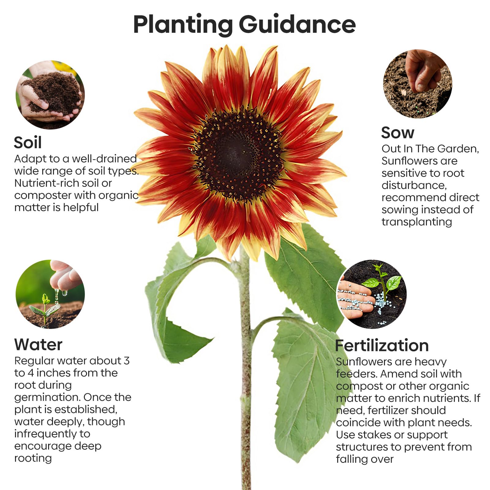 Easy-Growing Sunflower Seeds: Groundio mixed sunflower seeds are grown in the US! Just 6+ hours of sun a day and they’ll thrive. Super drought-resistant, so even hot summers won’t stop them. Great for yards, balconies, or small pots