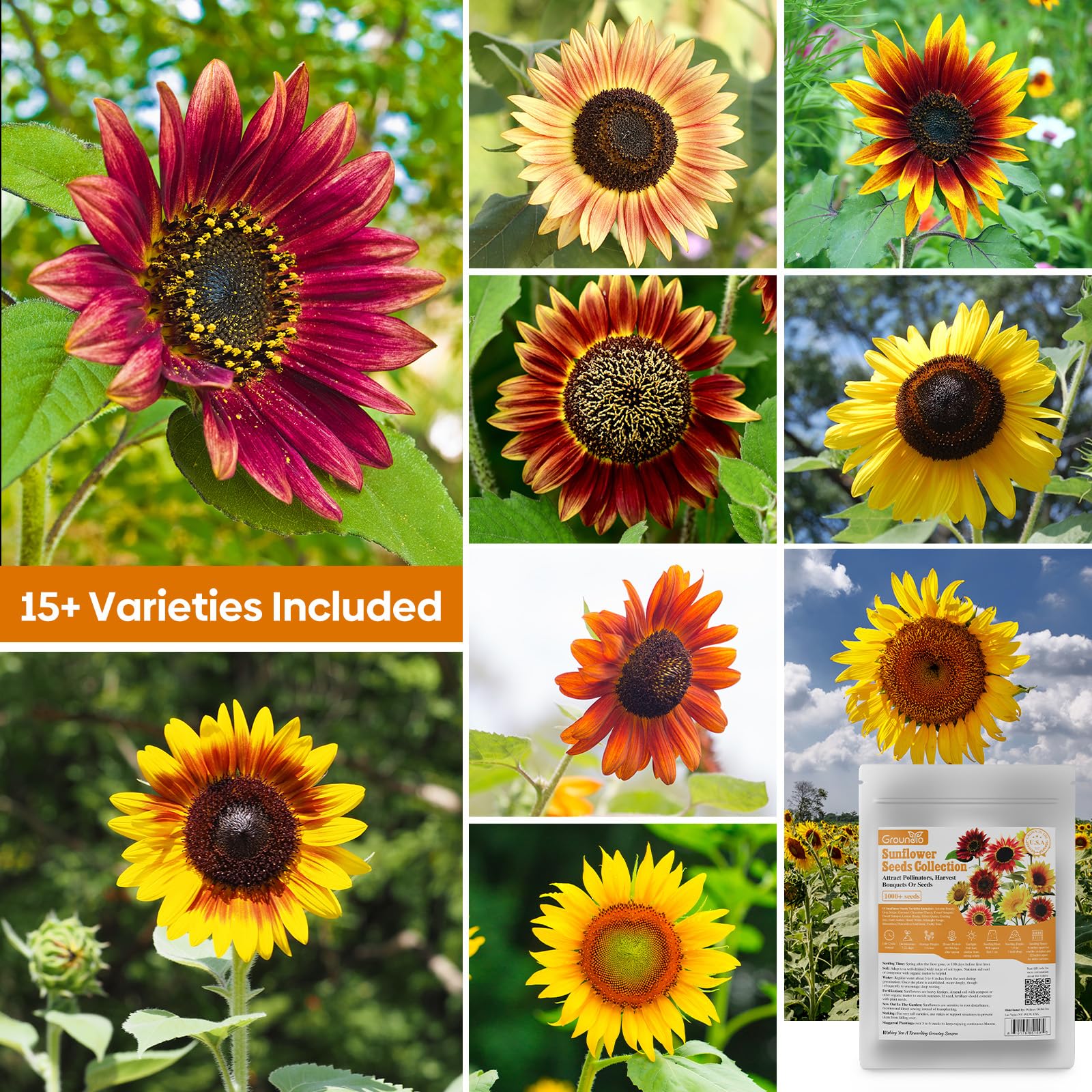 Bored of plain the one color sunflowers? Try Groundio’s 15-color mixed sunflower seeds for a rainbow garden experience! Grow more than just flowers Landscape uses: Perfect for yards, parks, or photo spots Edible benefits: Eat the seeds directly or use them for oil Attract pollination: Attracts bees and provides winter food for birds Grows almost anywhere Survives -15°C to 40°C weather Specs 1 oz pack = 1000+ seeds Height: 3-6 feet tall lTimeline: Sprouts in 7-21 days, blooms in 60-90 days