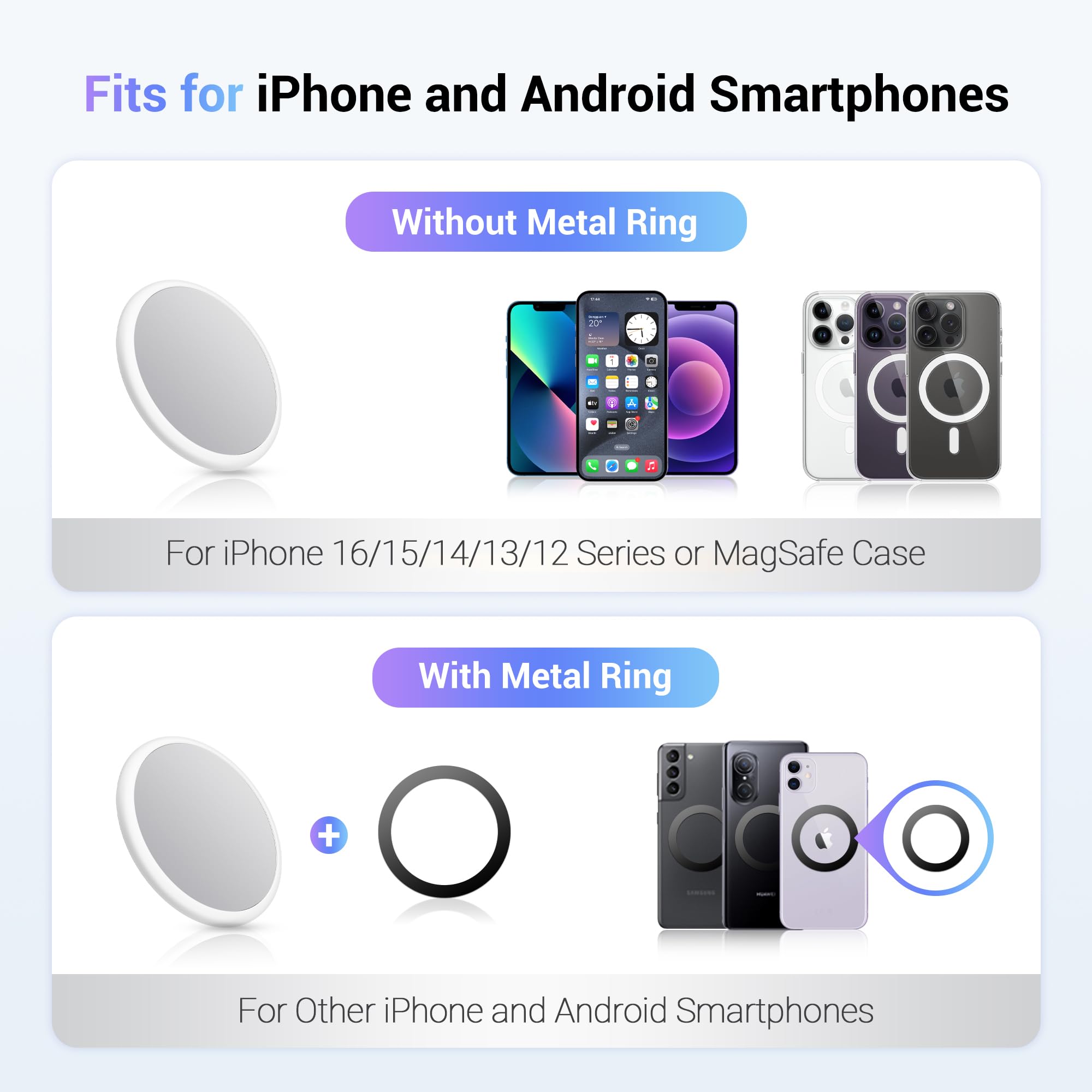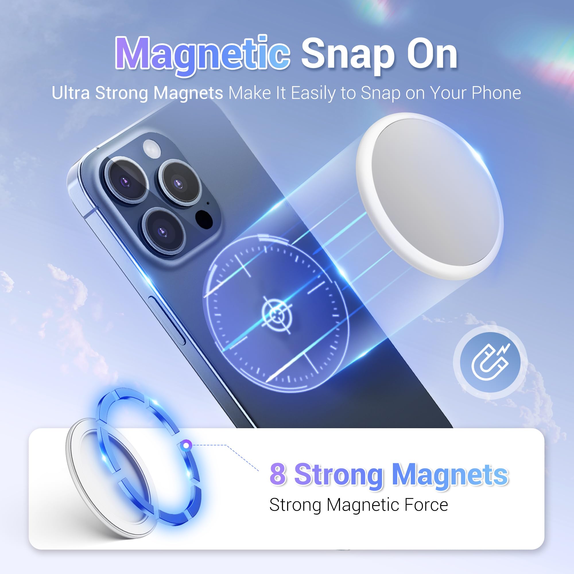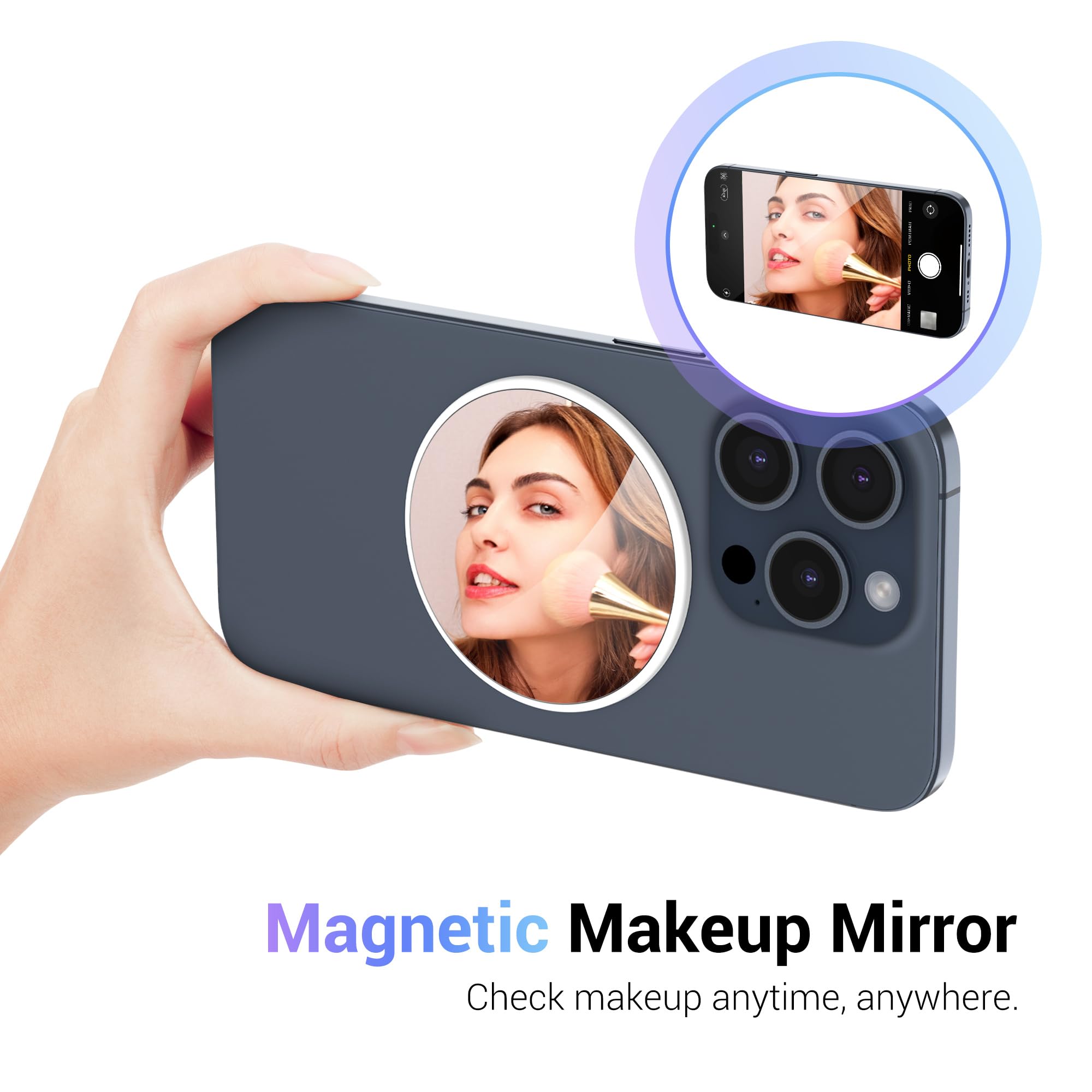 【Wide Compatibility】Features a strong magnetic ring , lets you quickly snap the mirror on your phone. The mirror decal is not only compatible with iPhone 17/ iPhone 16/iPhone 15/iPhone 14/iPhone 13/iPhone 12 Series with MagSafe function, MagSafe cases, but also for Non-Magsafe phone by using the included metal ring.