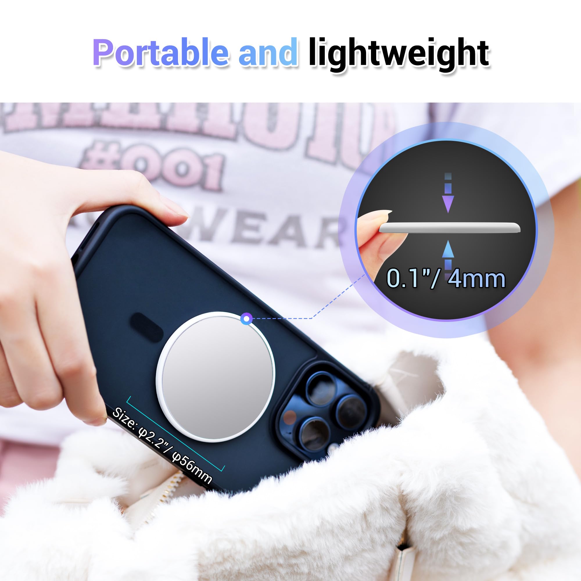 【Slim Design】The mirror is made of high quality ABS material, durable and sturdy. The slim design with a thickness of 0.16”/4mm which will not interfere the use of the phone.