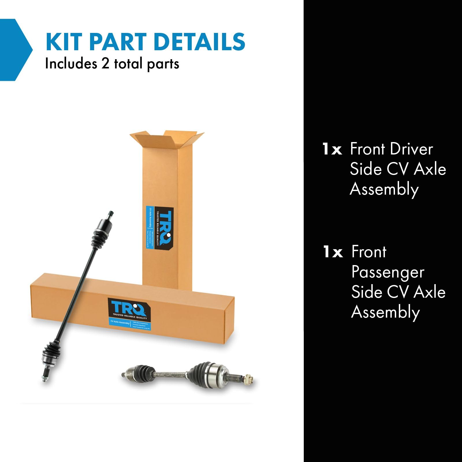 2 Piece CV Axle Assembly Set Kit Includes (1) Front Driver Side CV Axle Assembly (1) Front Passenger Side CV Axle Assembly Fitment Compatible with: 2006-13 Honda Civic Automatic Transmission Front Driver & Passenger Side Compatible with: 2014-15 Honda Civic Natural Gas Front Driver & Passenger Side Product Attributes Quantity: 2 Piece Product Features 100% New: Manufactured to tighter tolerances for extended service life Neoprene Boots: Improved durability compared to stock material Moly Greased: Specifically-designed grease shield to reduce premature wear Application Specific Design: No modification Item Details TRQ CV (constant velocity) drive axles are manufactured using premium raw materials designed to restore original performance. TRQ CV drive axles are new, so there is no core charge with your TRQ purchase. TRQ-designed drive axles utilize neoprene boots, moly grease, stainless steel clamps, and heat-treated ball tracks to ensure extended service life. Each TRQ axle is application-specific so each spline and thread will mate properly for a seamless fit. All products are fit and road-tested in our Massachusetts R&D facility to ensure we deliver on our promise of Trusted Reliable Quality. Reference Numbers 44305SNA000 44305SNEA01 44306SNA000 44306SNA900 44306SNEA01 44306SNEA11 44306TR0A02 66-4232 66-4233 664233 HO-8409 HO-8410 HO8219 HO8409 HO8410 NCV36007 NCV36568 NCV36569