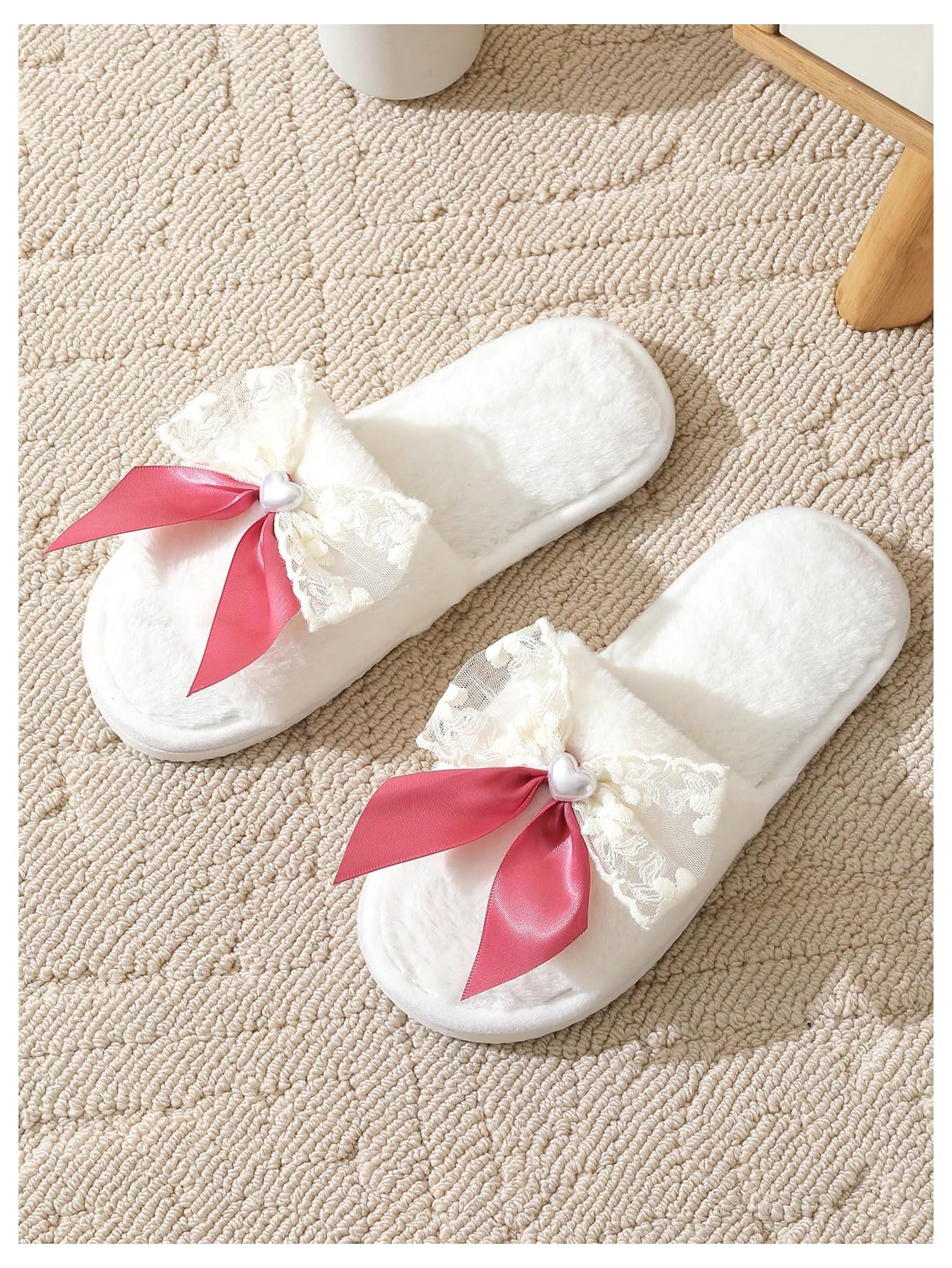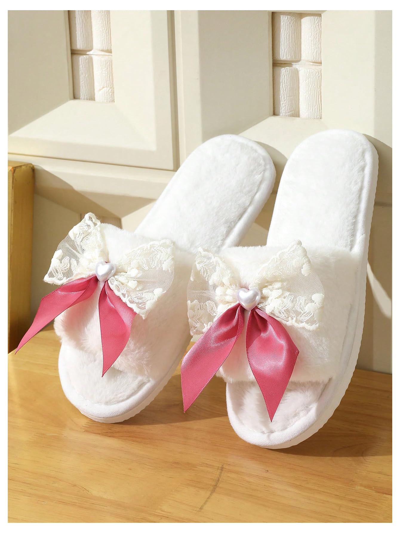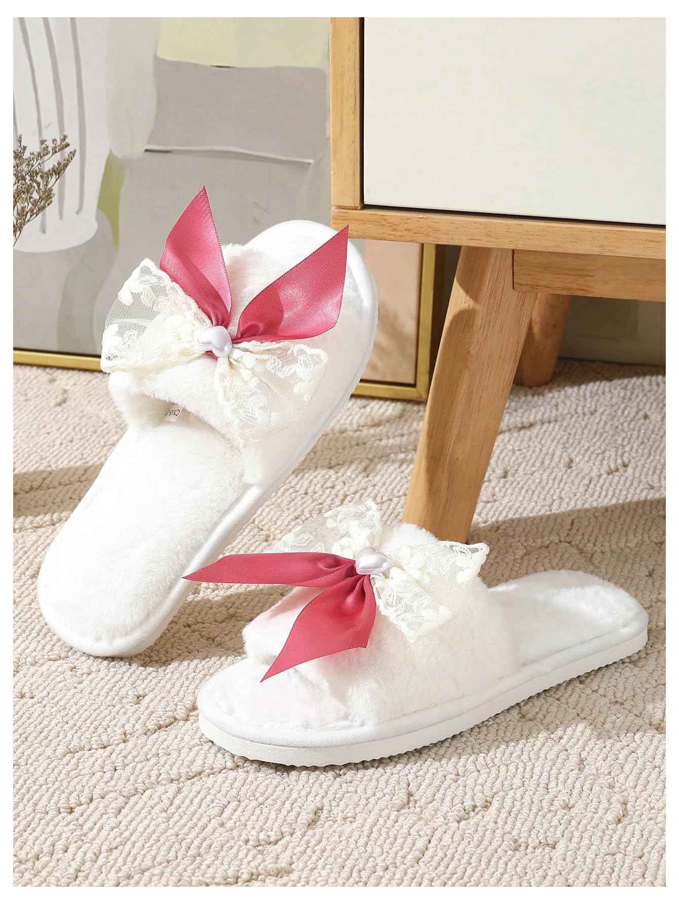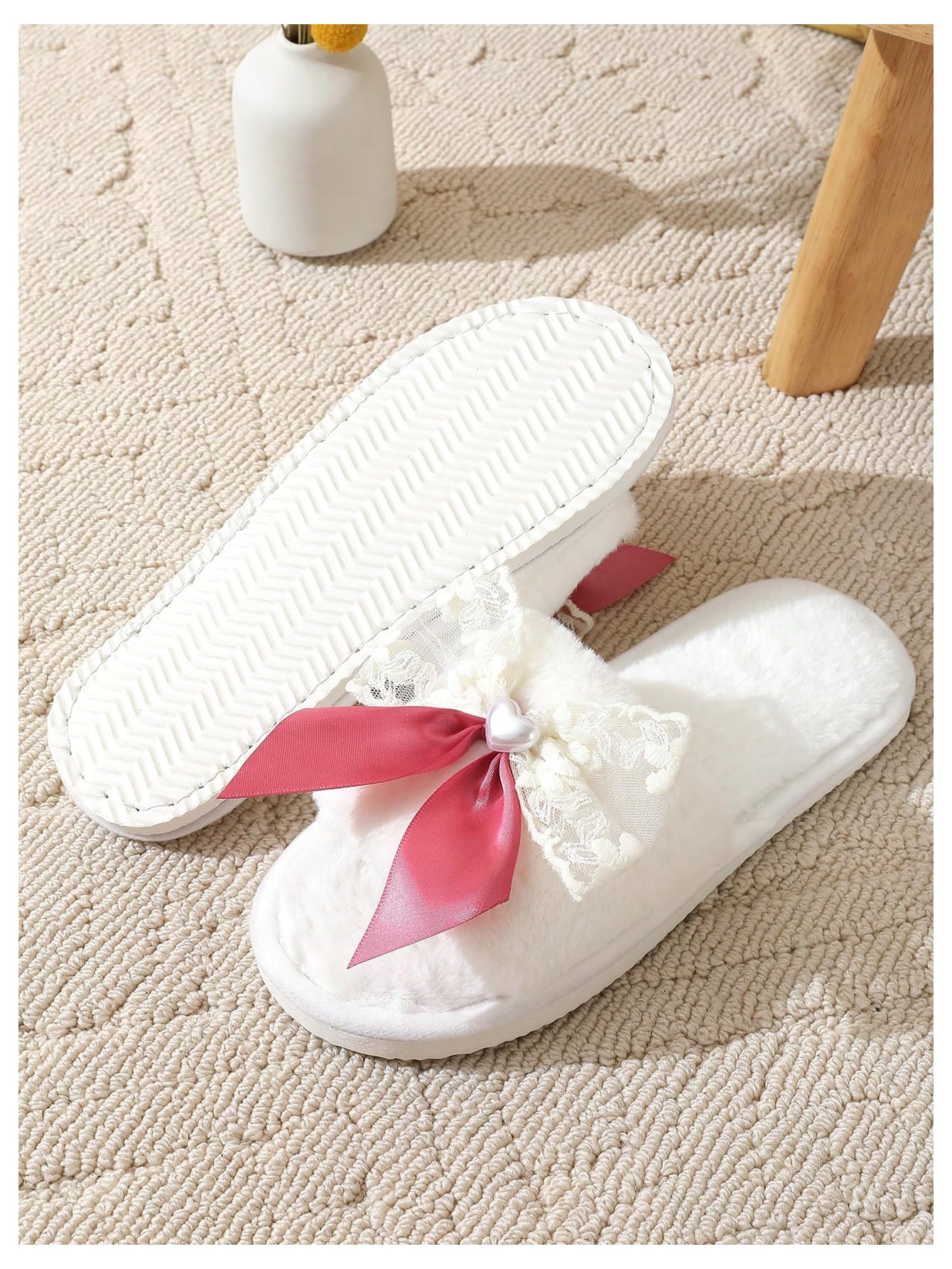 Fuzzy upper and lining, cute bow knot, furry indoor slippers